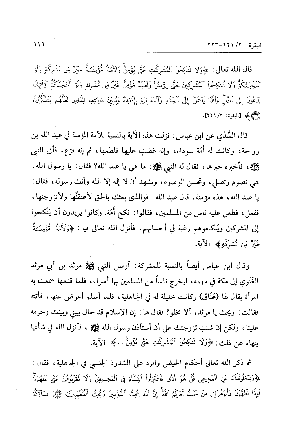 وَلا تَنْكِحُوا الْمُشْرِكاتِ حَتَّى يُؤْمِنَّ وَلَأَمَةٌ مُؤْمِنَةٌ خَيْرٌ مِنْ مُشْرِكَةٍ وَلَوْ أَعْجَبَتْكُمْ وَلا تُنْكِحُوا الْمُشْرِكِينَ حَتَّى يُؤْمِنُوا وَلَعَبْدٌ مُؤْمِنٌ خَيْرٌ مِنْ مُشْرِكٍ وَلَوْ أَعْجَبَكُمْ أُولئِكَ يَدْعُونَ إِلَى النَّارِ وَاللَّهُ يَدْعُوا إِلَى الْجَنَّةِ وَالْمَغْفِرَةِ بِإِذْنِهِ وَيُبَيِّنُ آياتِهِ لِلنَّاسِ لَعَلَّهُمْ يَتَذَكَّرُونَ (221)