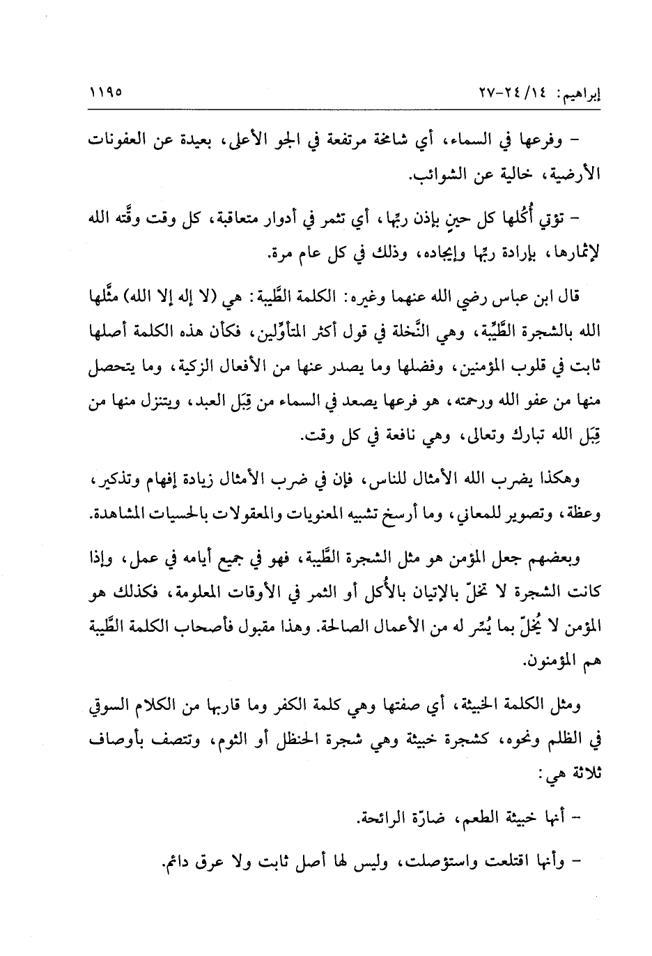 قال ابن عباس رضي الله عنهما وغيره: الكلمة الطّيبة: هي (لا إله إلا الله) مثّلها الله بالشجرة الطّيّبة، وهي النّخلة في قول أكثر المتأوّلين، فكأن هذه الكلمة أصلها ثابت في قلوب المؤمنين، وفضلها وما يصدر عنها من الأفعال الزكية، وما يتحصل منها من عفو الله ورحمته، هو فرعها يصعد في السماء من قبل العبد، ويتنزل منها من قبل الله تبارك وتعالى، وهي نافعة في كل وقت.