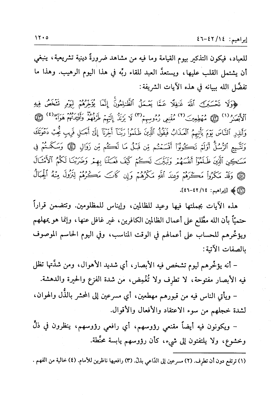 وَلا تَحْسَبَنَّ اللَّهَ غافِلاً عَمَّا يَعْمَلُ الظَّالِمُونَ إِنَّما يُؤَخِّرُهُمْ لِيَوْمٍ تَشْخَصُ فِيهِ الْأَبْصارُ (42) مُهْطِعِينَ مُقْنِعِي رُؤُسِهِمْ لا يَرْتَدُّ إِلَيْهِمْ طَرْفُهُمْ وَأَفْئِدَتُهُمْ هَواءٌ (43) وَأَنْذِرِ النَّاسَ يَوْمَ يَأْتِيهِمُ الْعَذابُ فَيَقُولُ الَّذِينَ ظَلَمُوا رَبَّنا أَخِّرْنا إِلى أَجَلٍ قَرِيبٍ نُجِبْ دَعْوَتَكَ وَنَتَّبِعِ الرُّسُلَ أَوَلَمْ تَكُونُوا أَقْسَمْتُمْ مِنْ قَبْلُ ما لَكُمْ مِنْ زَوالٍ (44) وَسَكَنْتُمْ فِي مَساكِنِ الَّذِينَ ظَلَمُوا أَنْفُسَهُمْ وَتَبَيَّنَ لَكُمْ كَيْفَ فَعَلْنا بِهِمْ وَضَرَبْنا لَكُمُ الْأَمْثالَ (45) وَقَدْ مَكَرُوا مَكْرَهُمْ وَعِنْدَ اللَّهِ مَكْرُهُمْ وَإِنْ كانَ مَكْرُهُمْ لِتَزُولَ مِنْهُ الْجِبالُ (46)