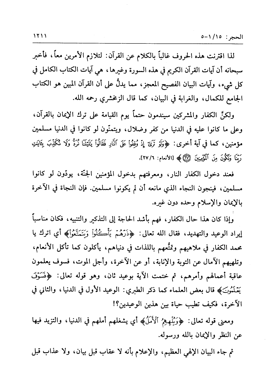 ولكنّ الكفار والمشركين سيندمون حتما يوم القيامة على ترك الإيمان بالقرآن، وعلى ما كانوا عليه في الدنيا من كفر وضلال، ويتمنّون لو كانوا في الدنيا مسلمين مؤمنين، كما في آية أخرى: وَلَوْ تَرى إِذْ وُقِفُوا عَلَى النَّارِ فَقالُوا يا لَيْتَنا نُرَدُّ وَلا نُكَذِّبَ بِآياتِ رَبِّنا وَنَكُونَ مِنَ الْمُؤْمِنِينَ (27) [الأنعام: 6/ 27] .