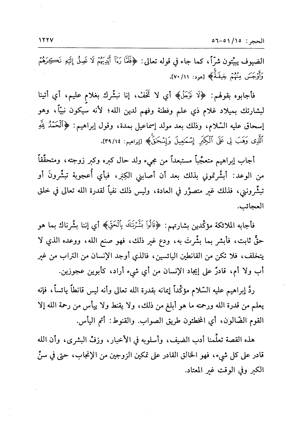 أجاب إبراهيم متعجّبا مستبعدا من مجيء ولد حال كبره وكبر زوجته، ومتحقّقا من الوعد: أبشّرتموني بذلك بعد أن أصابني الكبر، فبأي أعجوبة تبشّرون أو تبشّرونني، فذلك غير متصوّر في العادة، وليس ذلك نفيا لقدرة الله تعالى في خلق العجائب.
