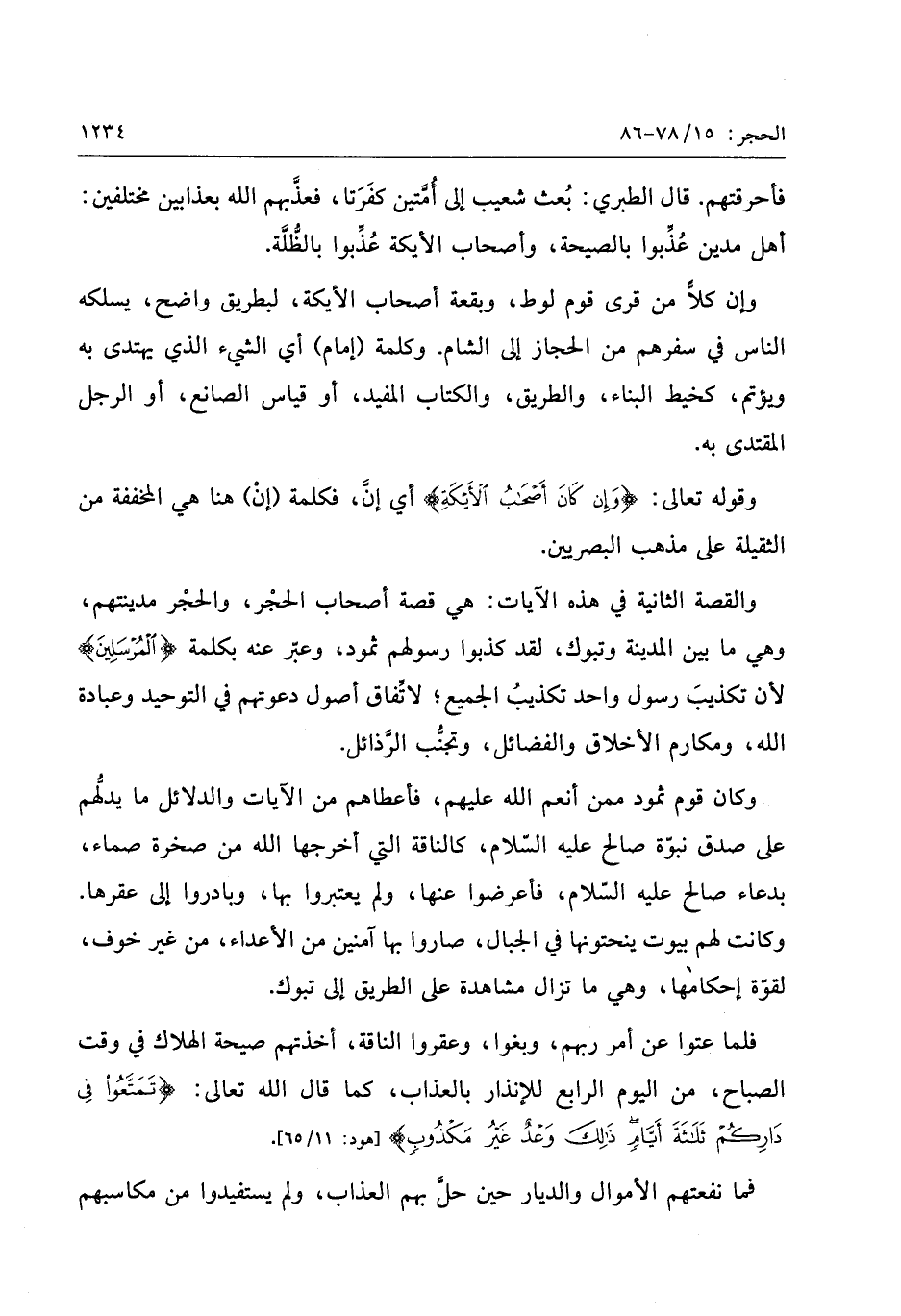 والقصة الثانية في هذه الآيات: هي قصة أصحاب الحجر، والحجر مدينتهم، وهي ما بين المدينة وتبوك، لقد كذبوا رسولهم ثمود، وعبّر عنه بكلمة الْمُرْسَلِينَ لأن تكذيب رسول واحد تكذيب الجميع لاتّفاق أصول دعوتهم في التوحيد وعبادة الله، ومكارم الأخلاق والفضائل، وتجنّب الرّذائل.