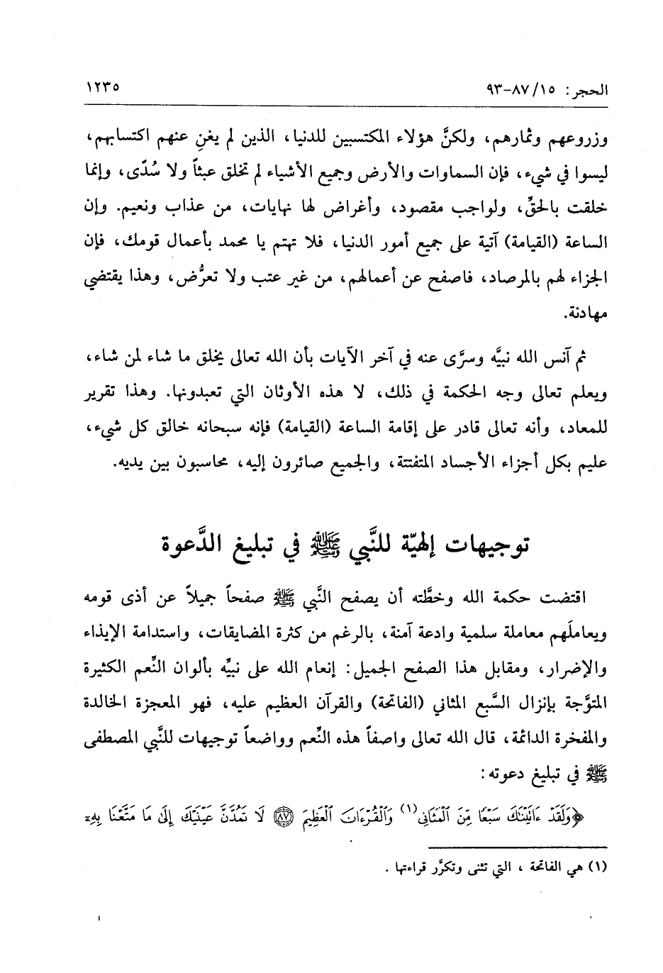 اقتضت حكمة الله وخطّته أن يصفح النّبي صلّى الله عليه وسلّم صفحا جميلا عن أذى قومه ويعاملهم معاملة سلمية وادعة آمنة، بالرغم من كثرة المضايقات، واستدامة الإيذاء والإضرار، ومقابل هذا الصفح الجميل: إنعام الله على نبيّه بألوان النّعم الكثيرة المتوّجه بإنزال السّبع المثاني (الفاتحة) والقرآن العظيم عليه، فهو المعجزة الخالدة والمفخرة الدائمة، قال الله تعالى واصفا هذه النّعم وواضعا توجيهات للنّبي المصطفى صلّى الله عليه وسلّم في تبليغ دعوته:
