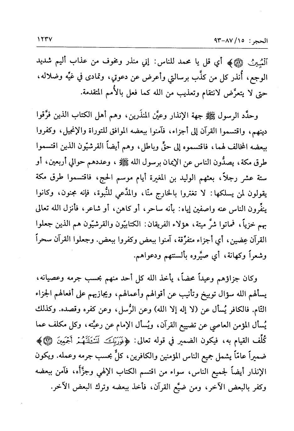وكان جزاؤهم وعيدا محضا، يأخذ الله كل أحد منهم بحسب جرمه وعصيانه، يسألهم الله سؤال توبيخ وتأنيب عن أقوالهم وأعمالهم، ويجازيهم على أفعالهم الجزاء التّام. فالكافر يسأل عن (لا إله إلا الله) وعن الرّسل، وعن كفره وقصده. وكذلك يسأل المؤمن العاصي عن تضييع القرآن، ويسأل الإمام عن رعيّته، وكل مكلف عما كلّف القيام به، فيكون الضمير في قوله تعالى: فَوَ رَبِّكَ لَنَسْئَلَنَّهُمْ أَجْمَعِينَ (92) ضميرا عامّا يشمل جميع الناس المؤمنين والكافرين، كلّ بحسب جرمه وعمله. ويكون الإنذار أيضا لجميع الناس، سواء من اقتسم الكتاب الإلهي وجزّأه، فآمن ببعضه وكفر بالبعض الآخر، ومن ضيّع القرآن، فأخذ ببعضه وترك البعض الآخر.