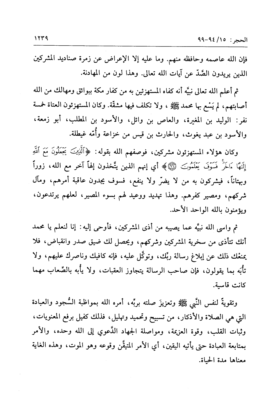 وكان هؤلاء المستهزئون مشركين، فوصفهم الله بقوله: الَّذِينَ يَجْعَلُونَ مَعَ اللَّهِ إِلهاً آخَرَ فَسَوْفَ يَعْلَمُونَ (96) أي إنهم الذين يتّخذون إلها آخر مع الله، زورا وبهتانا، فيشركون به من لا يضرّ ولا ينفع، فسوف يجدون عاقبة أمرهم، ومآل شركهم، ومصير كفرهم. وهذا تهديد ووعيد لهم بسوء المصير، لعلهم يرتدعون، ويؤمنون بالله الواحد الأحد.