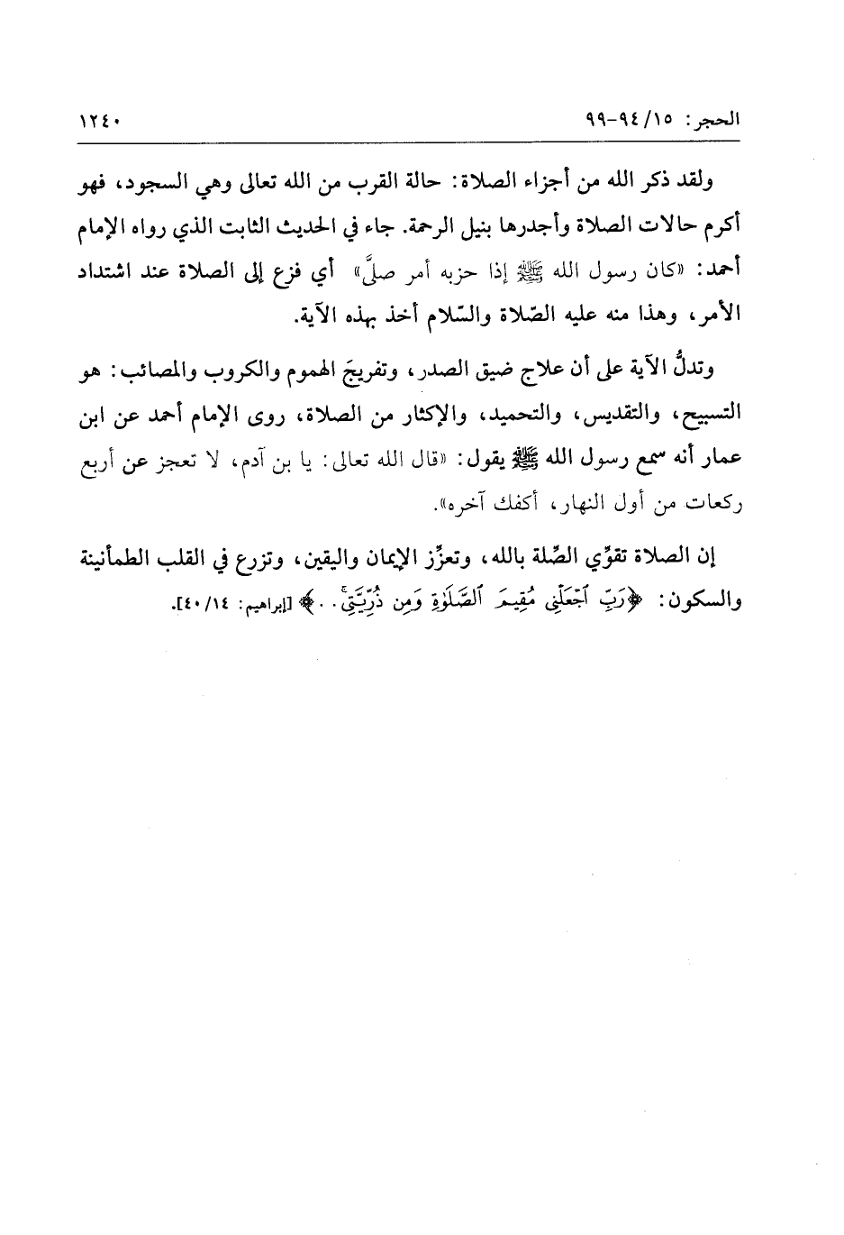 إن الصلاة تقوّي الصّلة بالله، وتعزّز الإيمان واليقين، وتزرع في القلب الطمأنينة والسكون: رَبِّ اجْعَلْنِي مُقِيمَ الصَّلاةِ وَمِنْ ذُرِّيَّتِي.. [إبراهيم: 14/ 40] .