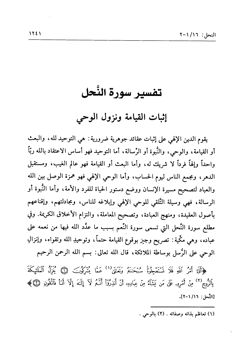يقوم الدين الإلهي على إثبات عقائد جوهرية ضرورية: هي التوحيد لله، والبعث أو القيامة، والوحي، والنّبوة أو الرّسالة، أما التوحيد فهو أساس الاعتقاد بالله ربّا واحدا وإلها فردا لا شريك له، وأما البعث أو القيامة فهو عالم الغيب، ومستقبل الدهر، ومجمع الناس ليوم الحساب، وأما الوحي الإلهي فهو همزة الوصل بين الله والعباد لتصحيح مسيرة الإنسان ووضع دستور الحياة للفرد والأمة، وأما النّبوة أو الرسالة، فهي وسيلة التّلقي للوحي الإلهي وإبلاغه للناس، ومجادلتهم، وإقناعهم بأصول العقيدة، ومنهج العبادة، وتصحيح المعاملة، والتزام الأخلاق الكريمة. وفي مطلع سورة النّحل التي تسمى سورة النّعم بسبب ما عدّد الله فيها من نعمه على عباده، وهي مكّية: تصريح وجيز بوقوع القيامة حتما، وتوحيد الله وتقواه، وإنزال الوحي على الرّسل بوساطة الملائكة، قال الله تعالى: بسم الله الرحمن الرحيم