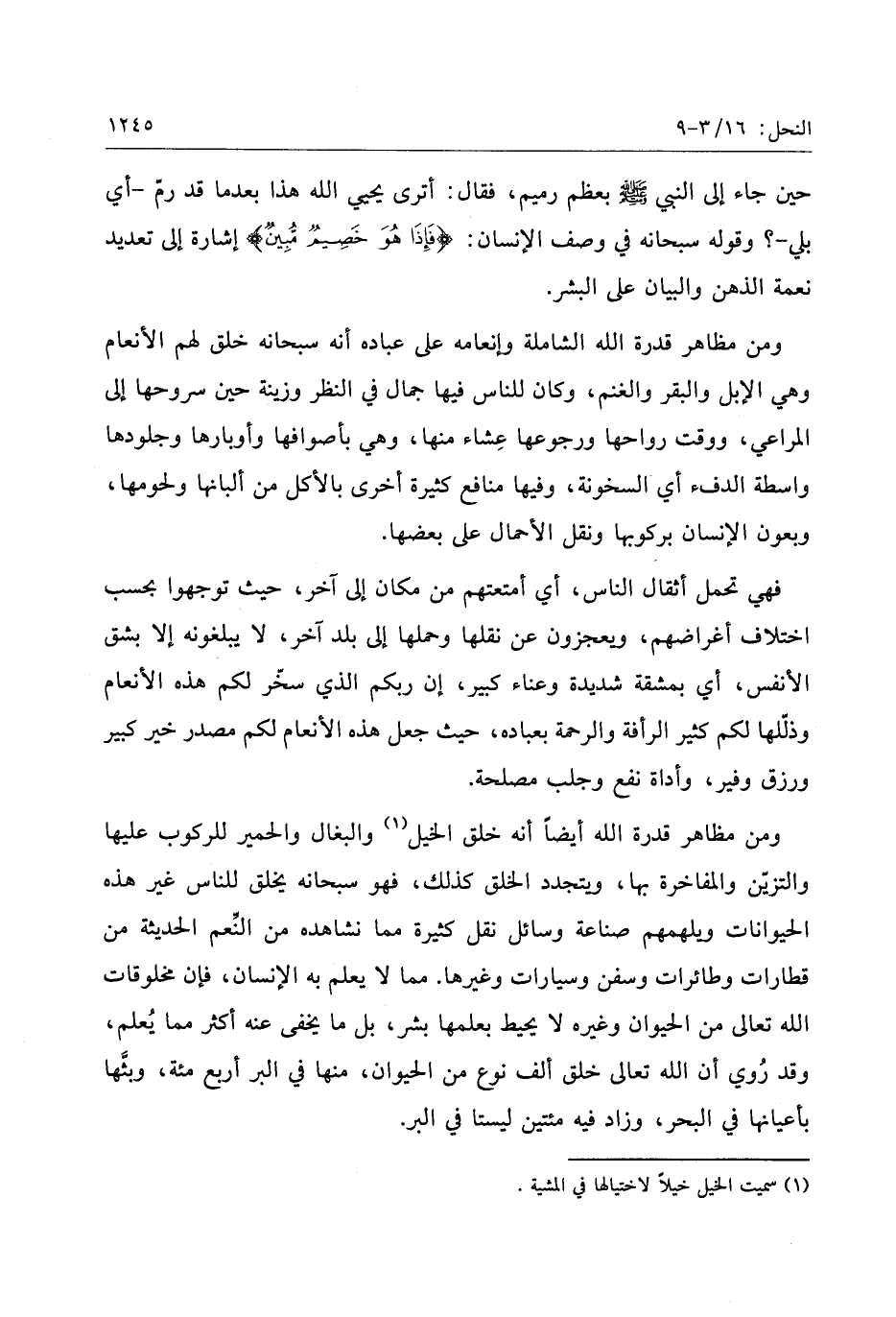 ومن مظاهر قدرة الله أيضا أنه خلق الخيل «1» والبغال والحمير للركوب عليها والتزيّن والمفاخرة بها، ويتجدد الخلق كذلك، فهو سبحانه يخلق للناس غير هذه الحيوانات ويلهمهم صناعة وسائل نقل كثيرة مما نشاهده من النّعم الحديثة من قطارات وطائرات وسفن وسيارات وغيرها. مما لا يعلم به الإنسان، فإن مخلوقات الله تعالى من الحيوان وغيره لا يحيط بعلمها بشر، بل ما يخفى عنه أكثر مما يعلم، وقد روي أن الله تعالى خلق ألف نوع من الحيوان، منها في البر أربع مائة، وبثّها بأعيانها في البحر، وزاد فيه مائتين ليستا في البر.