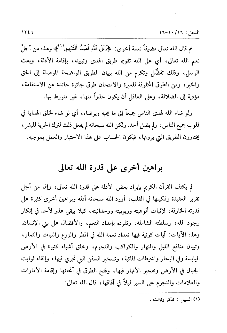 ثم قال الله تعالى مضيفا نعمة أخرى: وَعَلَى اللَّهِ قَصْدُ السَّبِيلِ «1» وهذه من أجلّ نعم الله تعالى، أي على الله تقويم طريق الهدى وتبيينه، بإقامة الأدلة، وبعث الرسل، وذلك تفضّل وتكرم من الله ببيان الطريق الواضحة الموصلة إلى الحق والخير، ومن الطرق المخلوقة للعبرة والامتحان طرق جائرة حائدة عن الاستقامة، مؤدية إلى الضلالة، وعلى العاقل أن يكون حذرا منها، غير متورط بها.