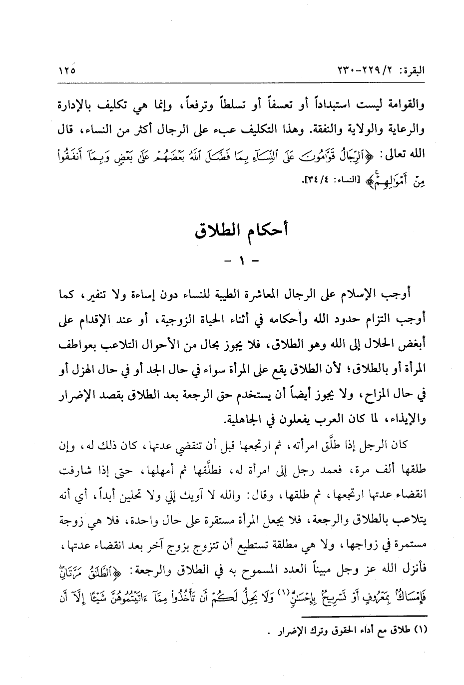 الطَّلاقُ مَرَّتانِ فَإِمْساكٌ بِمَعْرُوفٍ أَوْ تَسْرِيحٌ بِإِحْسانٍ وَلا يَحِلُّ لَكُمْ أَنْ تَأْخُذُوا مِمَّا آتَيْتُمُوهُنَّ شَيْئاً إِلاَّ أَنْ يَخافا أَلاَّ يُقِيما حُدُودَ اللَّهِ فَإِنْ خِفْتُمْ أَلاَّ يُقِيما حُدُودَ اللَّهِ فَلا جُناحَ عَلَيْهِما فِيمَا افْتَدَتْ بِهِ تِلْكَ حُدُودُ اللَّهِ فَلا تَعْتَدُوها وَمَنْ يَتَعَدَّ حُدُودَ اللَّهِ فَأُولئِكَ هُمُ الظَّالِمُونَ (229) فَإِنْ طَلَّقَها فَلا تَحِلُّ لَهُ مِنْ بَعْدُ حَتَّى تَنْكِحَ زَوْجاً غَيْرَهُ فَإِنْ طَلَّقَها فَلا جُناحَ عَلَيْهِما أَنْ يَتَراجَعا إِنْ ظَنَّا أَنْ يُقِيما حُدُودَ اللَّهِ وَتِلْكَ حُدُودُ اللَّهِ يُبَيِّنُها لِقَوْمٍ يَعْلَمُونَ (230)
