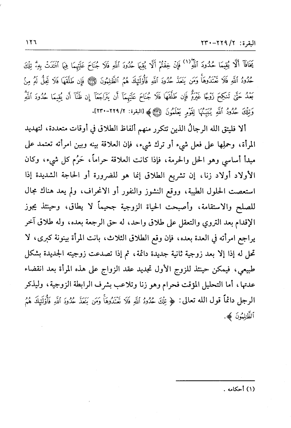 ألا فليتق الله الرجال الذين تتكرر منهم ألفاظ الطلاق في أوقات متعددة، لتهديد المرأة، وحملها على فعل شيء أو ترك شيء، فإن العلاقة بينه وبين امرأته تعتمد على مبدأ أساسي وهو الحل والحرمة، فإذا كانت العلاقة حراما، حرم كل شيء، وكان الأولاد أولاد زنا، إن تشريع الطلاق إنما هو للضرورة أو الحاجة الشديدة إذا استعصت الحلول الطيبة، ووقع النشوز والنفور أو الانحراف، ولم يعد هناك مجال للصلح والاستقامة، وأصبحت الحياة الزوجية جحيما لا يطاق، وحينئذ يجوز الإقدام بعد التروي والتعقل على طلاق واحد، له حق الرجعة بعده، وله طلاق آخر يراجع امرأته في العدة بعده، فإن وقع الطلاق الثلاث، بانت المرأة بينونة كبري، لا تحل له إذا إلا بعد زوجية ثانية جديدة دائمة، ثم إذا تصدعت زوجيته الجديدة بشكل طبيعي، فيمكن حينئذ للزوج الأول تجديد عقد الزواج على هذه المرأة بعد انقضاء عدتها، أما التحليل المؤقت فحرام وهو زنا وتلاعب بشرف الرابطة الزوجية، وليذكر الرجل دائما قول الله تعالى: تِلْكَ حُدُودُ اللَّهِ فَلا تَعْتَدُوها وَمَنْ يَتَعَدَّ حُدُودَ اللَّهِ فَأُولئِكَ هُمُ الظَّالِمُونَ.