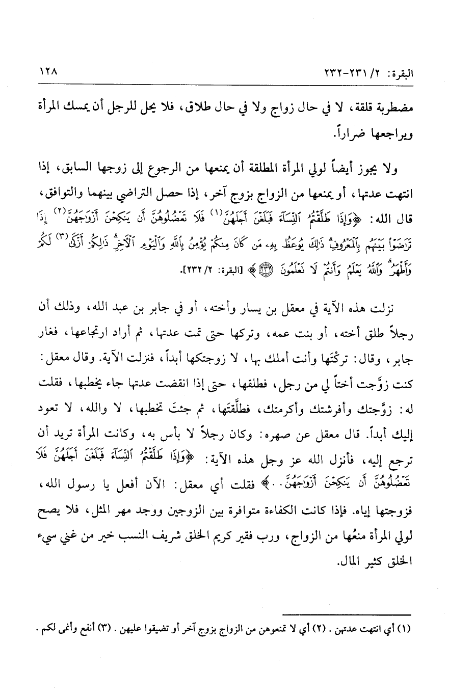 وَإِذا طَلَّقْتُمُ النِّساءَ فَبَلَغْنَ أَجَلَهُنَّ فَلا تَعْضُلُوهُنَّ أَنْ يَنْكِحْنَ أَزْواجَهُنَّ إِذا تَراضَوْا بَيْنَهُمْ بِالْمَعْرُوفِ ذلِكَ يُوعَظُ بِهِ مَنْ كانَ مِنْكُمْ يُؤْمِنُ بِاللَّهِ وَالْيَوْمِ الْآخِرِ ذلِكُمْ أَزْكى لَكُمْ وَأَطْهَرُ وَاللَّهُ يَعْلَمُ وَأَنْتُمْ لا تَعْلَمُونَ (232)