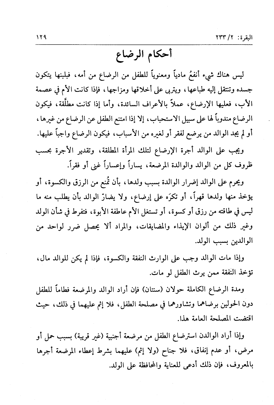 ومدة الرضاع الكاملة حولان (سنتان) فإن أراد الوالد والمرضعة فطاما للطفل دون الحولين برضاهما وتشاورهما في مصلحة الطفل، فلا إثم عليهما في ذلك، حيث اقتضت المصلحة العامة هذا.