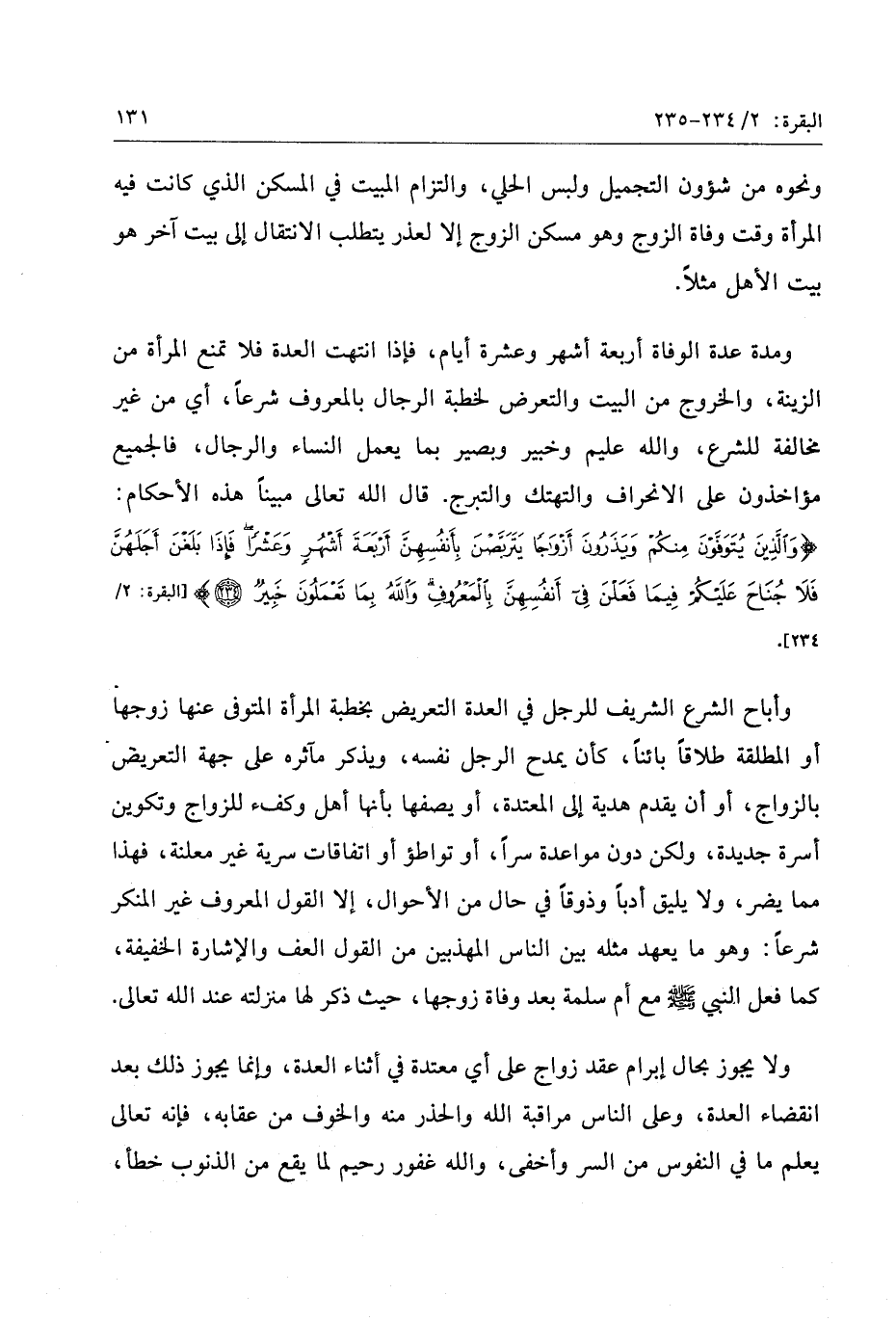 وَالَّذِينَ يُتَوَفَّوْنَ مِنْكُمْ وَيَذَرُونَ أَزْواجاً يَتَرَبَّصْنَ بِأَنْفُسِهِنَّ أَرْبَعَةَ أَشْهُرٍ وَعَشْراً فَإِذا بَلَغْنَ أَجَلَهُنَّ فَلا جُناحَ عَلَيْكُمْ فِيما فَعَلْنَ فِي أَنْفُسِهِنَّ بِالْمَعْرُوفِ وَاللَّهُ بِما تَعْمَلُونَ خَبِيرٌ (234)
