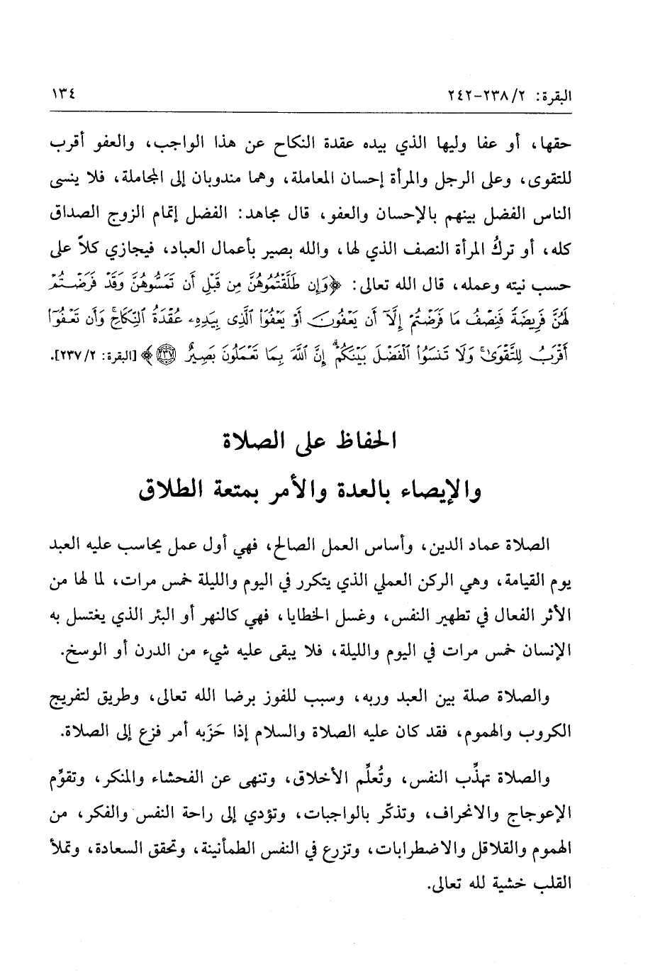 الحفاظ على الصلاة والإيصاء بالعدة والأمر بمتعة الطلاق
