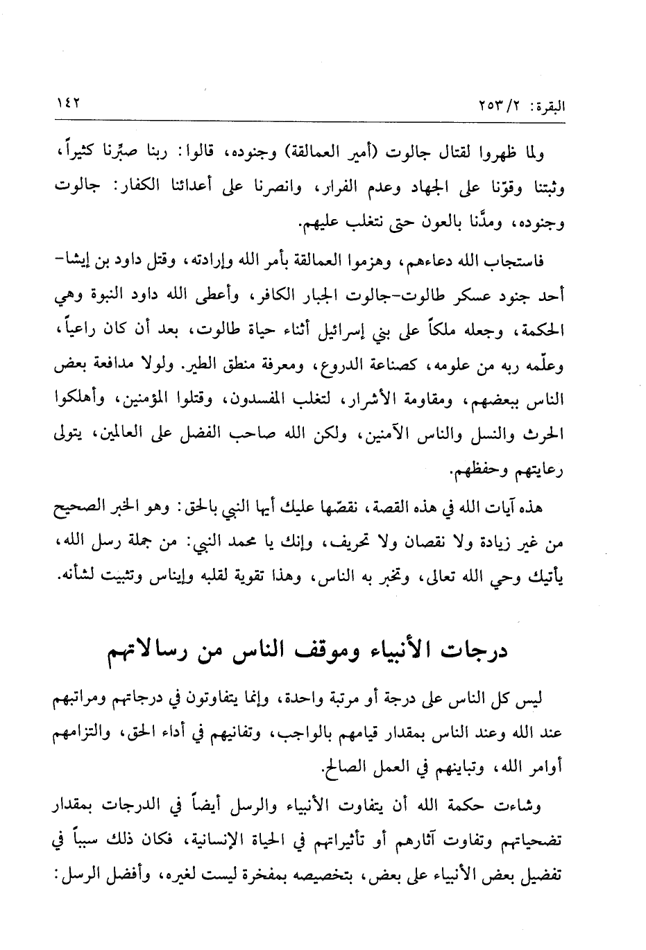 فاستجاب الله دعاءهم، وهزموا العمالقة بأمر الله وإرادته، وقتل داود بن إيشا- أحد جنود عسكر طالوت- جالوت الجبار الكافر، وأعطى الله داود النبوة وهي الحكمة، وجعله ملكا على بني إسرائيل أثناء حياة طالوت، بعد أن كان راعيا، وعلّمه ربه من علومه، كصناعة الدروع، ومعرفة منطق الطير. ولولا مدافعة بعض الناس ببعضهم، ومقاومة الأشرار، لتغلب المفسدون، وقتلوا المؤمنين، وأهلكوا الحرث والنسل والناس الآمنين، ولكن الله صاحب الفضل على العالمين، يتولى رعايتهم وحفظهم.