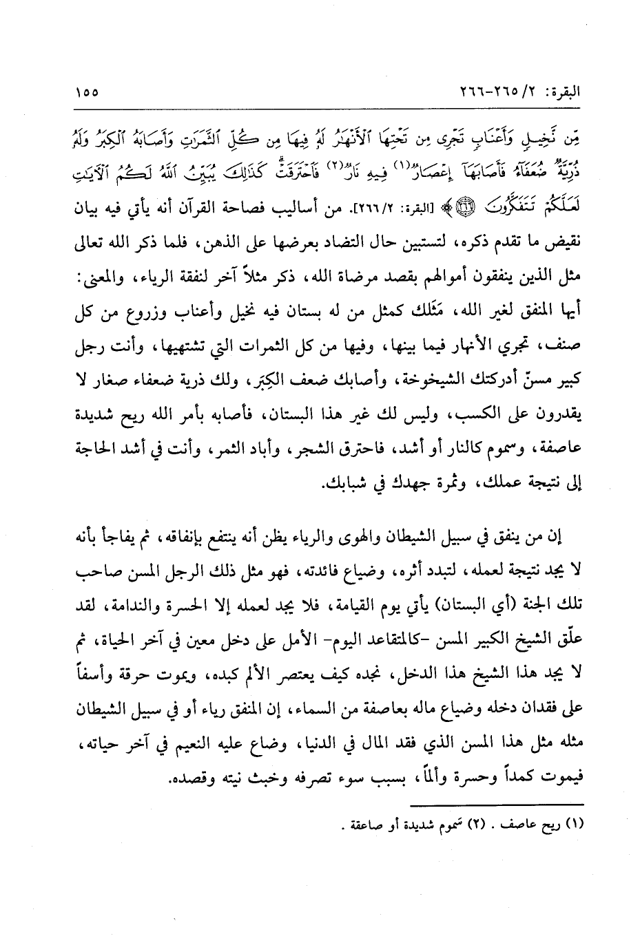 أيها المنفق لغير الله، مثلك كمثل من له بستان فيه نخيل وأعناب وزروع من كل صنف، تجري الأنهار فيما بينها، وفيها من كل الثمرات التي تشتهيها، وأنت رجل كبير مسنّ أدركتك الشيوخة، وأصابك ضعف الكبر، ولك ذرية ضعفاء صغار لا يقدرون على الكسب، وليس لك غير هذا البستان، فأصابه بأمر الله ريح شديدة عاصفة، وسموم كالنار أو أشد، فاحترق الشجر، وأباد الثمر، وأنت في أشد الحاجة إلى نتيجة عملك، وثمرة جهدك في شبابك.