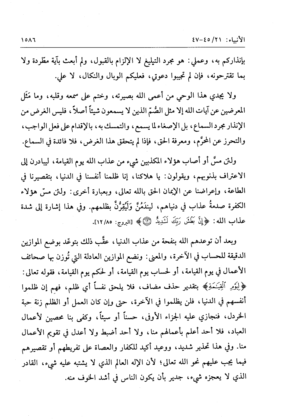 وبعد أن توعدهم الله بنفحة من عذاب الدنيا، عقّب ذلك بتوعّد بوضع الموازين الدقيقة للحساب في الآخرة، والمعنى: ونضع الموازين العادلة التي توزن بها صحائف الأعمال في يوم القيامة، أو لحساب يوم القيامة، أو لحكم يوم القيامة، فقوله تعالى: