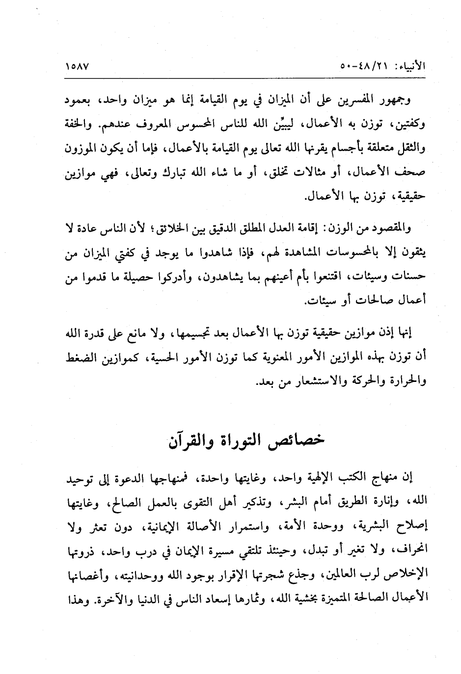 إنها إذن موازين حقيقية توزن بها الأعمال بعد تجسيمها، ولا مانع على قدرة الله أن توزن بهذه الموازين الأمور المعنوية كما توزن الأمور الحسية، كموازين الضغط والحرارة والحركة والاستشعار من بعد.