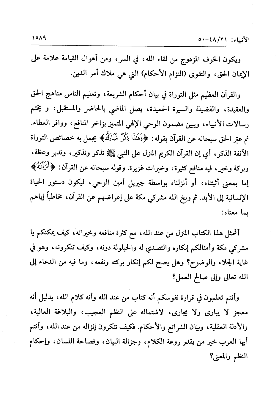 والقرآن العظيم مثل التوراة في بيان أحكام الشريعة، وتعليم الناس مناهج الحق والعقيدة، والفضيلة والسيرة الحميدة، يصل الماضي بالحاضر والمستقبل، ويختم رسالات الأنبياء، ويبين مضمون الوحي الإلهي المتميز بزاخر المنافع، ووافر العطاء.