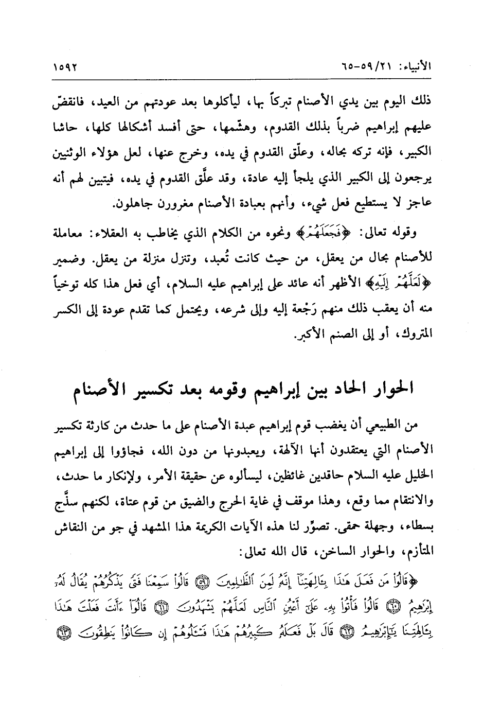 قالُوا مَنْ فَعَلَ هذا بِآلِهَتِنا إِنَّهُ لَمِنَ الظَّالِمِينَ (59) قالُوا سَمِعْنا فَتًى يَذْكُرُهُمْ يُقالُ لَهُ إِبْراهِيمُ (60) قالُوا فَأْتُوا بِهِ عَلى أَعْيُنِ النَّاسِ لَعَلَّهُمْ يَشْهَدُونَ (61) قالُوا أَأَنْتَ فَعَلْتَ هذا بِآلِهَتِنا يا إِبْراهِيمُ (62) قالَ بَلْ فَعَلَهُ كَبِيرُهُمْ هذا فَسْئَلُوهُمْ إِنْ كانُوا يَنْطِقُونَ (63)