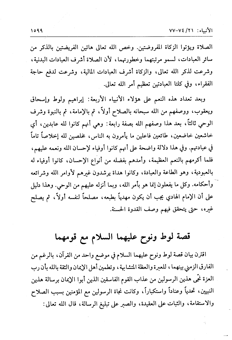 وبعد تعداد هذه النعم على هؤلاء الأنبياء الأربعة: إبراهيم ولوط وإسحاق ويعقوب، ووصفهم من الله سبحانه بالصلاح أولا، ثم بالإمامة، ثم بالنبوة وشرف الوحي ثالثا، بعد هذا وصفهم الله بصفة رابعة: وهي أنهم كانوا لله عابدين، أي خاشعين خاضعين، طائعين فاعلين ما يأمرون به الناس، مخلصين لله إخلاصا تاما في عبادتهم. وفي هذا دلالة واضحة على أنهم كانوا أوفياء لإحسان الله ونعمه عليهم، فلما أكرمهم بالنعم العظيمة، وأمدهم بفضله من أنواع الإحسان، كانوا أوفياء له بالعبودية، وهو الطاعة والعبادة، وكانوا هداة يرشدون غيرهم لأوامر الله وشرائعه وأحكامه. وكل ما يفعلون إنما هو بأمر الله، وبما أنزله عليهم من الوحي. وهذا دليل على أن الإمام الهادي يجب أن يكون مهديا بطبعه، مصلحا لنفسه أولا، ثم يصلح غيره، حتى يتحقق فيهم وصف القدوة الحسنة.