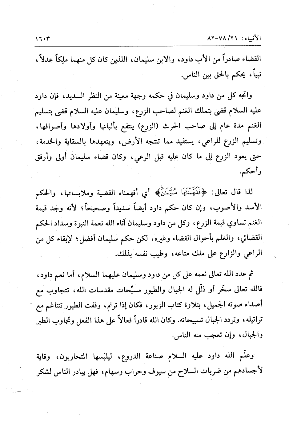 لذا قال تعالى: فَفَهَّمْناها سُلَيْمانَ أي أفهمناه القضية وملابساتها، والحكم الأسد والأصوب، وإن كان حكم داود أيضا سديدا وصحيحا لأنه وجد قيمة الغنم تساوي قيمة الزرع، وكل من داود وسليمان آتاه الله نعمة النبوة وسداد الحكم القضائي، والعلم بأحوال القضاء وغيره، لكن حكم سليمان أفضل لإبقاء كل من الراعي والزارع على ملك متاعه، وطيب نفسه بذلك.