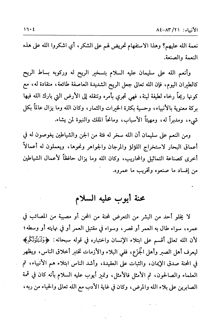 لا يخلو أحد من البشر من التعرض لمحنة من المحن أو مصيبة من المصائب في عمره، سواء طال به العمر أو قصر، وسواء في مقتبل العمر أو في نهايته أو وسطه لأن الله تعالى أقسم على ابتلاء الإنسان واختباره في قوله سبحانه: وَلَنَبْلُوَنَّكُمْ ليعرف أهل الصبر وأهل الجزع، ففي البلاء والأزمات تختبر أخلاق الناس، ويظهر في المحنة صدق الإيمان، والثبات على العقيدة، وأشد الناس ابتلاء هم الأنبياء، ثم العلماء والصالحون، ثم الأمثل فالأمثل، وتميز أيوب عليه السلام بأنه كان في قمة الصابرين على بلاء الله والمرض، وكان في غاية الأدب مع الله تعالى والحياء من ربه،