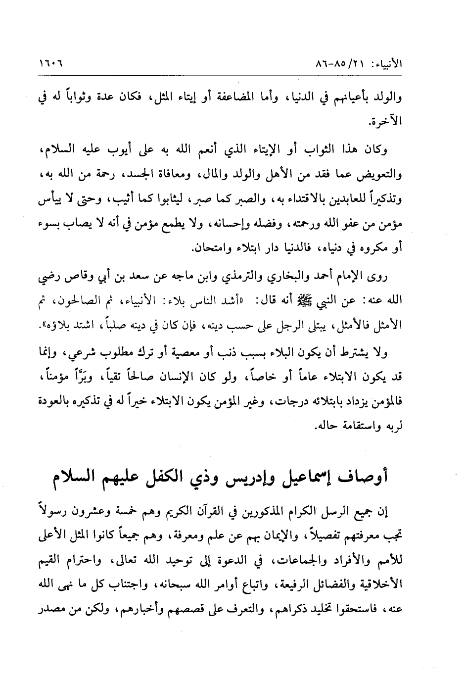 روى الإمام أحمد والبخاري والترمذي وابن ماجه عن سعد بن أبي وقاص رضي الله عنه: عن النبي صلّى الله عليه وسلّم أنه قال: «أشد الناس بلاء: الأنبياء، ثم الصالحون، ثم الأمثل فالأمثل، يبتلى الرجل على حسب دينه، فإن كان في دينه صلبا، اشتد بلاؤه» .