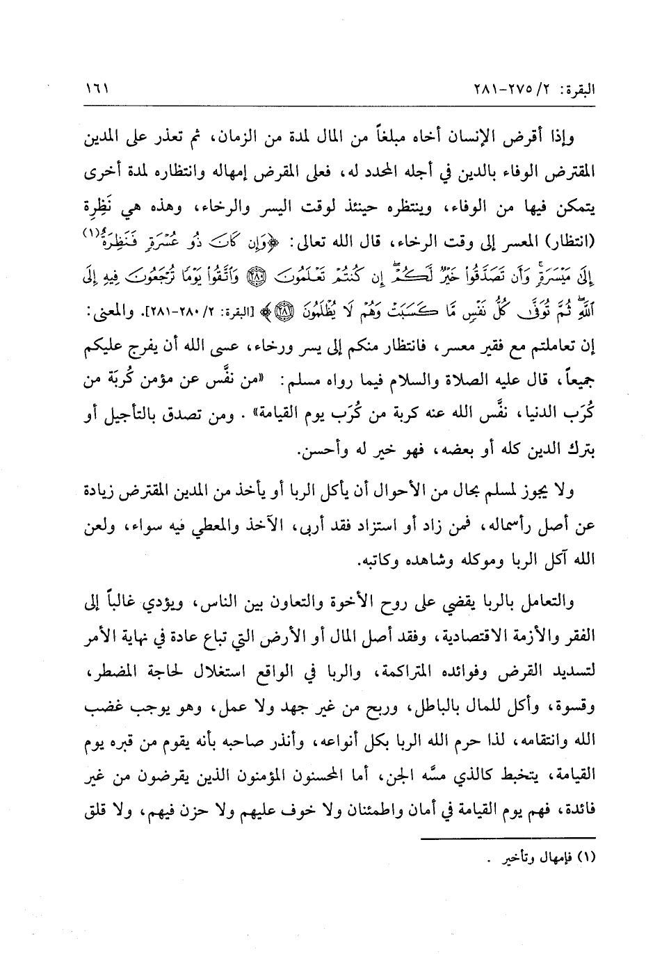 وَإِنْ كانَ ذُو عُسْرَةٍ فَنَظِرَةٌ إِلى مَيْسَرَةٍ وَأَنْ تَصَدَّقُوا خَيْرٌ لَكُمْ إِنْ كُنْتُمْ تَعْلَمُونَ (280) وَاتَّقُوا يَوْماً تُرْجَعُونَ فِيهِ إِلَى اللَّهِ ثُمَّ تُوَفَّى كُلُّ نَفْسٍ ما كَسَبَتْ وَهُمْ لا يُظْلَمُونَ (281)