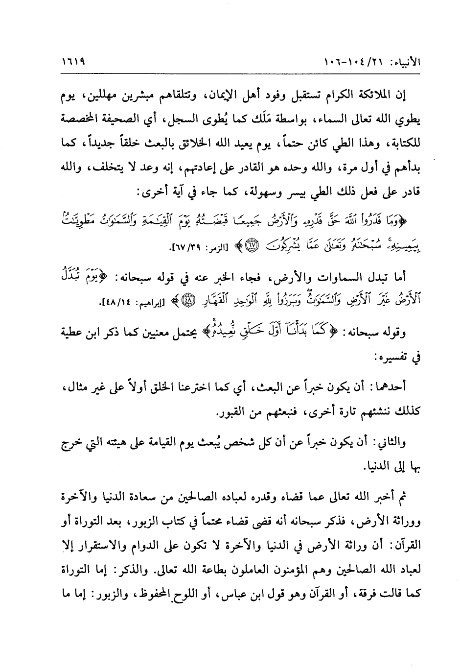 إن الملائكة الكرام تستقبل وفود أهل الإيمان، وتتلقاهم مبشرين مهللين، يوم يطوي الله تعالى السماء، بواسطة ملك كما يطوى السجل، أي الصحيفة المخصصة للكتابة، وهذا الطي كائن حتما، يوم يعيد الله الخلائق بالبعث خلقا جديدا، كما بدأهم في أول مرة، والله وحده هو القادر على إعادتهم، إنه وعد لا يتخلف، والله قادر على فعل ذلك الطي بيسر وسهولة، كما جاء في آية أخرى: