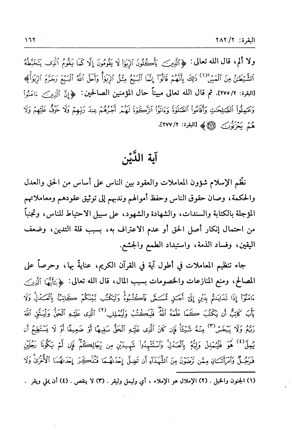 يا أَيُّهَا الَّذِينَ آمَنُوا إِذا تَدايَنْتُمْ بِدَيْنٍ إِلى أَجَلٍ مُسَمًّى فَاكْتُبُوهُ وَلْيَكْتُبْ بَيْنَكُمْ كاتِبٌ بِالْعَدْلِ وَلا يَأْبَ كاتِبٌ أَنْ يَكْتُبَ كَما عَلَّمَهُ اللَّهُ فَلْيَكْتُبْ وَلْيُمْلِلِ الَّذِي عَلَيْهِ الْحَقُّ وَلْيَتَّقِ اللَّهَ رَبَّهُ وَلا يَبْخَسْ مِنْهُ شَيْئاً فَإِنْ كانَ الَّذِي عَلَيْهِ الْحَقُّ سَفِيهاً أَوْ ضَعِيفاً أَوْ لا يَسْتَطِيعُ أَنْ يُمِلَّ هُوَ فَلْيُمْلِلْ وَلِيُّهُ بِالْعَدْلِ وَاسْتَشْهِدُوا شَهِيدَيْنِ مِنْ رِجالِكُمْ فَإِنْ لَمْ يَكُونا رَجُلَيْنِ فَرَجُلٌ وَامْرَأَتانِ مِمَّنْ تَرْضَوْنَ مِنَ الشُّهَداءِ أَنْ تَضِلَّ إِحْداهُما فَتُذَكِّرَ إِحْداهُمَا الْأُخْرى وَلا يَأْبَ الشُّهَداءُ إِذا ما دُعُوا وَلا تَسْئَمُوا أَنْ تَكْتُبُوهُ صَغِيراً أَوْ كَبِيراً إِلى أَجَلِهِ ذلِكُمْ أَقْسَطُ عِنْدَ اللَّهِ وَأَقْوَمُ لِلشَّهادَةِ وَأَدْنى أَلاَّ تَرْتابُوا إِلاَّ أَنْ تَكُونَ تِجارَةً حاضِرَةً تُدِيرُونَها بَيْنَكُمْ فَلَيْسَ عَلَيْكُمْ جُناحٌ أَلاَّ تَكْتُبُوها وَأَشْهِدُوا إِذا تَبايَعْتُمْ وَلا يُضَارَّ كاتِبٌ وَلا شَهِيدٌ وَإِنْ تَفْعَلُوا فَإِنَّهُ فُسُوقٌ بِكُمْ وَاتَّقُوا اللَّهَ وَيُعَلِّمُكُمُ اللَّهُ وَاللَّهُ بِكُلِّ شَيْءٍ عَلِيمٌ (282)