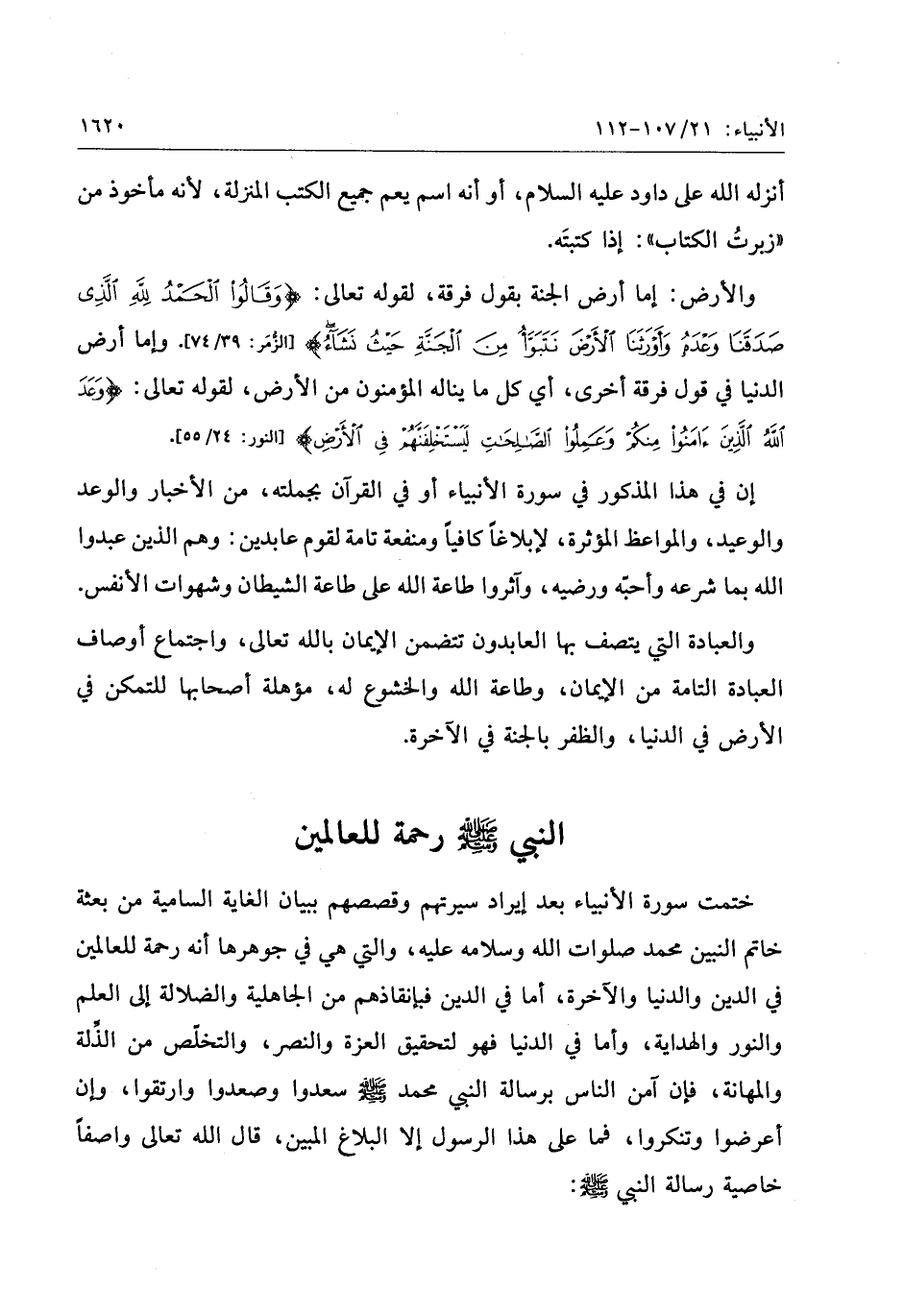 ختمت سورة الأنبياء بعد إيراد سيرتهم وقصصهم ببيان الغاية السامية من بعثة خاتم النبيين محمد صلوات الله وسلامه عليه، والتي هي في جوهرها أنه رحمة للعالمين في الدين والدنيا والآخرة، أما في الدين فبإنقاذهم من الجاهلية والضلالة إلى العلم والنور والهداية، وأما في الدنيا فهو لتحقيق العزة والنصر، والتخلّص من الذّلة والمهانة، فإن آمن الناس برسالة النبي محمد صلّى الله عليه وسلّم سعدوا وصعدوا وارتقوا، وإن أعرضوا وتنكروا، فما على هذا الرسول إلا البلاغ المبين، قال الله تعالى واصفا خاصية رسالة النبي صلّى الله عليه وسلّم: