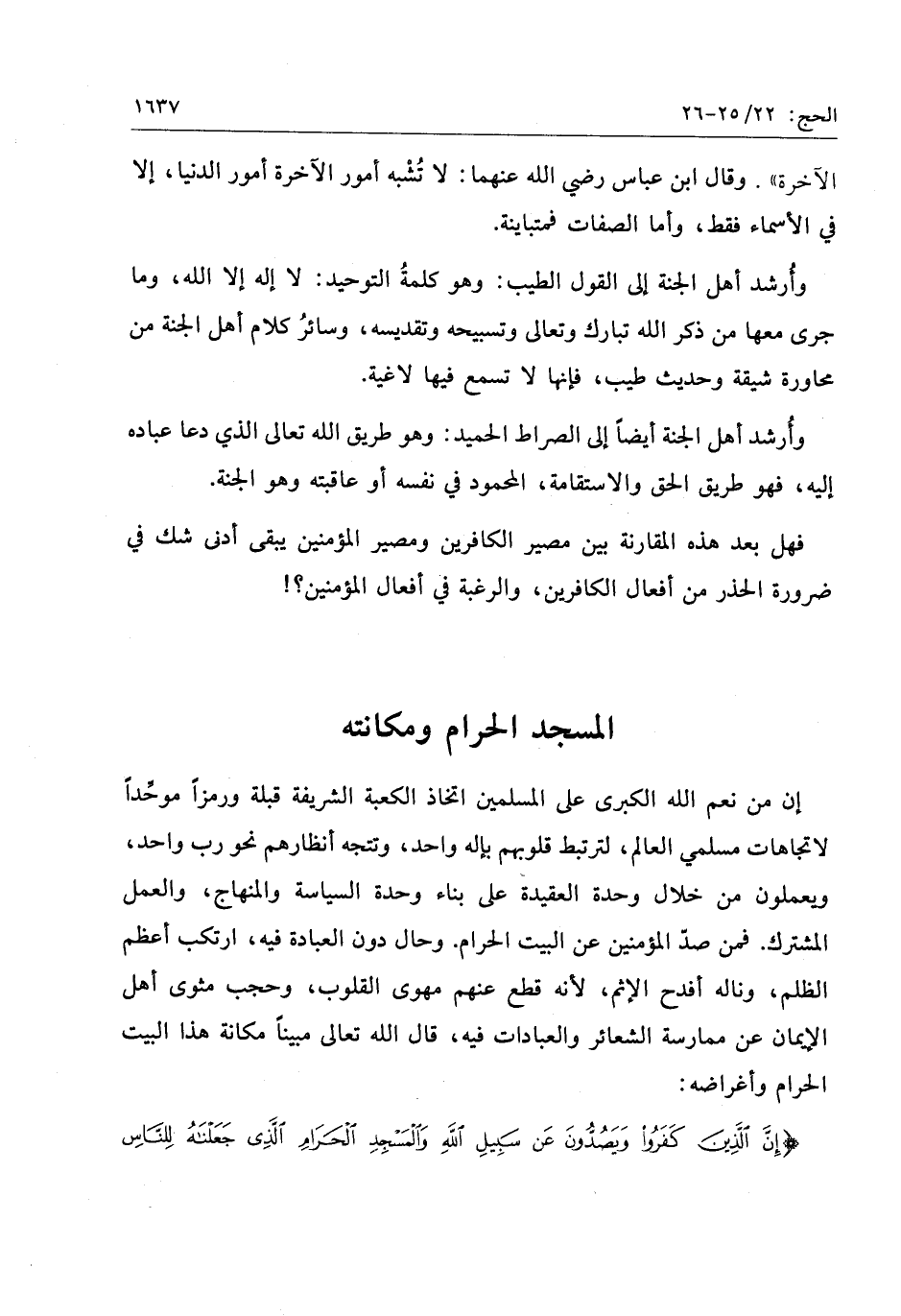 إِنَّ الَّذِينَ كَفَرُوا وَيَصُدُّونَ عَنْ سَبِيلِ اللَّهِ وَالْمَسْجِدِ الْحَرامِ الَّذِي جَعَلْناهُ لِلنَّاسِ سَواءً الْعاكِفُ فِيهِ وَالْبادِ وَمَنْ يُرِدْ فِيهِ بِإِلْحادٍ بِظُلْمٍ نُذِقْهُ مِنْ عَذابٍ أَلِيمٍ (25) وَإِذْ بَوَّأْنا لِإِبْراهِيمَ مَكانَ الْبَيْتِ أَنْ لا تُشْرِكْ بِي شَيْئاً وَطَهِّرْ بَيْتِيَ لِلطَّائِفِينَ وَالْقائِمِينَ وَالرُّكَّعِ السُّجُودِ (26)