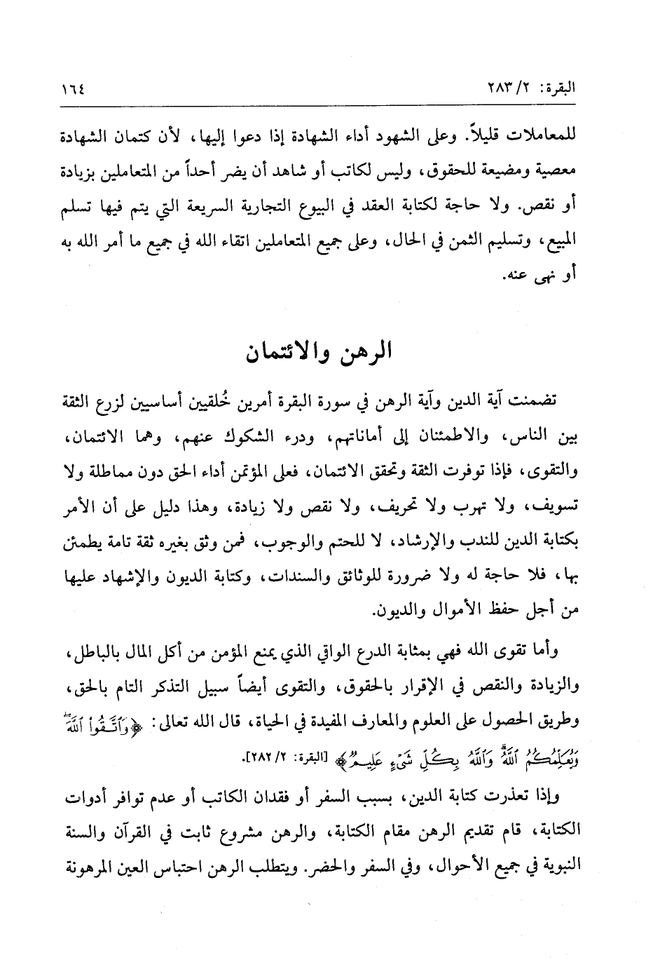 للمعاملات قليلا. وعلى الشهود أداء الشهادة إذا دعوا إليها، لأن كتمان الشهادة معصية ومضيعة للحقوق، وليس لكاتب أو شاهد أن يضر أحدا من المتعاملين بزيادة أو نقص. ولا حاجة لكتابة العقد في البيوع التجارية السريعة التي يتم فيها تسلم المبيع، وتسليم الثمن في الحال، وعلى جميع المتعاملين اتقاء الله في جميع ما أمر الله به أو نهى عنه.