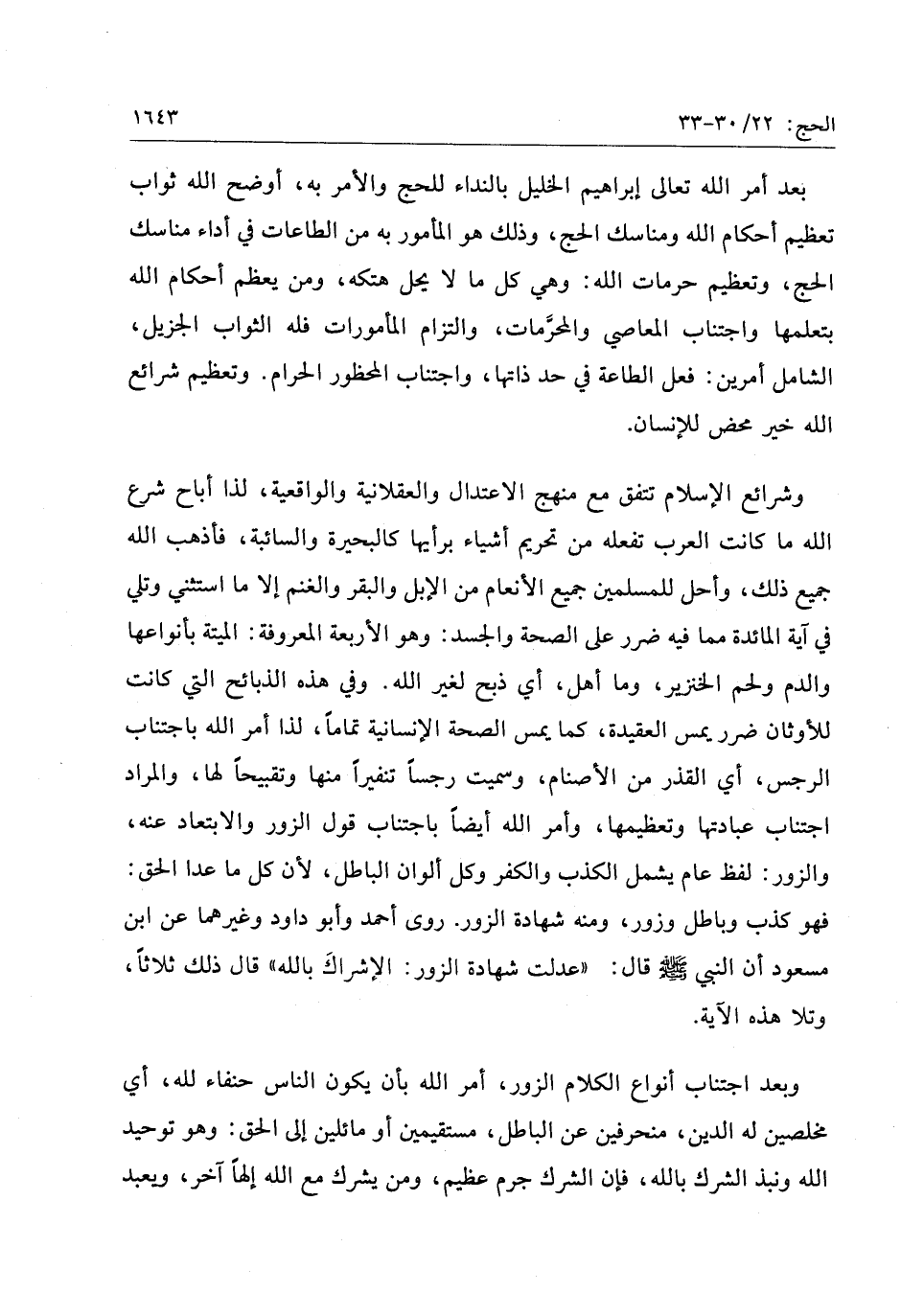 وشرائع الإسلام تتفق مع منهج الاعتدال والعقلانية والواقعية، لذا أباح شرع الله ما كانت العرب تفعله من تحريم أشياء برأيها كالبحيرة والسائبة، فأذهب الله جميع ذلك، وأحل للمسلمين جميع الأنعام من الإبل والبقر والغنم إلا ما استثني وتلي في آية المائدة مما فيه ضرر على الصحة والجسد: وهو الأربعة المعروفة: الميتة بأنواعها والدم ولحم الخنزير، وما أهل، أي ذبح لغير الله. وفي هذه الذبائح التي كانت للأوثان ضرر يمس العقيدة، كما يمس الصحة الإنسانية تماما، لذا أمر الله باجتناب الرجس، أي القذر من الأصنام، وسميت رجسا تنفيرا منها وتقبيحا لها، والمراد اجتناب عبادتها وتعظيمها، وأمر الله أيضا باجتناب قول الزور والابتعاد عنه، والزور: لفظ عام يشمل الكذب والكفر وكل ألوان الباطل، لأن كل ما عدا الحق: