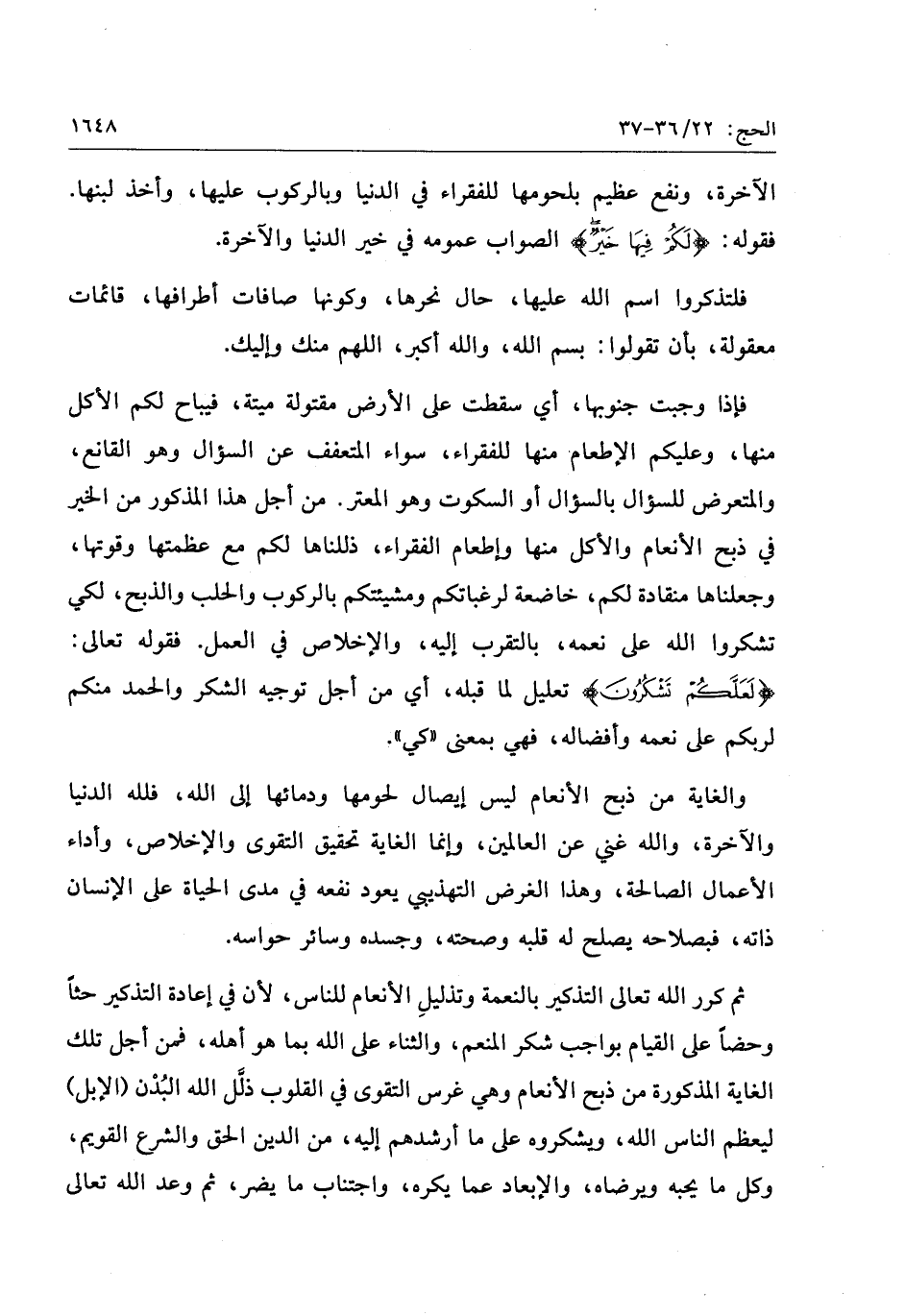 ثم كرر الله تعالى التذكير بالنعمة وتذليل الأنعام للناس، لأن في إعادة التذكير حثا وحضا على القيام بواجب شكر المنعم، والثناء على الله بما هو أهله، فمن أجل تلك الغاية المذكورة من ذبح الأنعام وهي غرس التقوى في القلوب ذلّل الله البدن (الإبل) ليعظم الناس الله، ويشكروه على ما أرشدهم إليه، من الدين الحق والشرع القويم، وكل ما يحبه ويرضاه، والإبعاد عما يكره، واجتناب ما يضر، ثم وعد الله تعالى