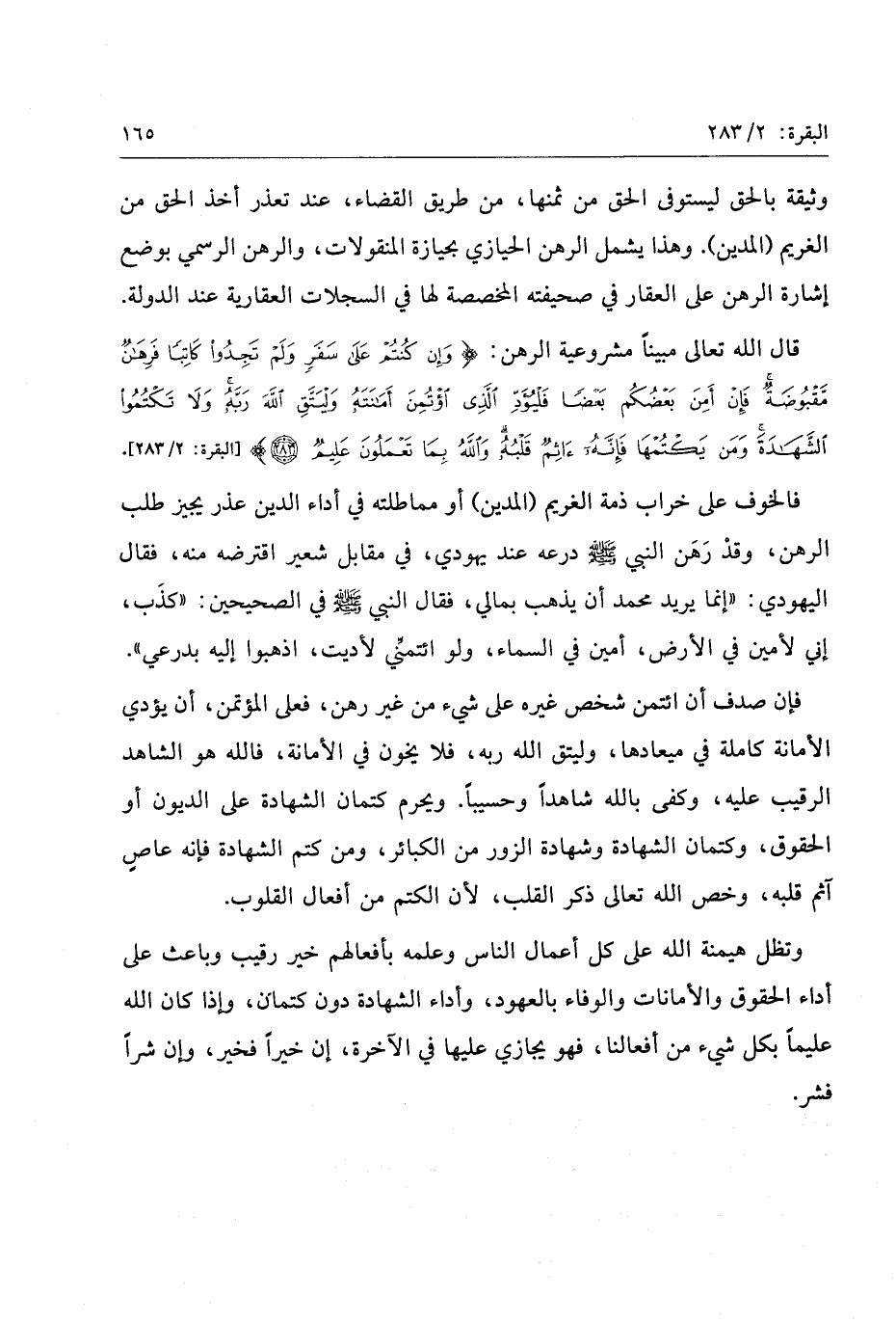 وَإِنْ كُنْتُمْ عَلى سَفَرٍ وَلَمْ تَجِدُوا كاتِباً فَرِهانٌ مَقْبُوضَةٌ فَإِنْ أَمِنَ بَعْضُكُمْ بَعْضاً فَلْيُؤَدِّ الَّذِي اؤْتُمِنَ أَمانَتَهُ وَلْيَتَّقِ اللَّهَ رَبَّهُ وَلا تَكْتُمُوا الشَّهادَةَ وَمَنْ يَكْتُمْها فَإِنَّهُ آثِمٌ قَلْبُهُ وَاللَّهُ بِما تَعْمَلُونَ عَلِيمٌ (283)