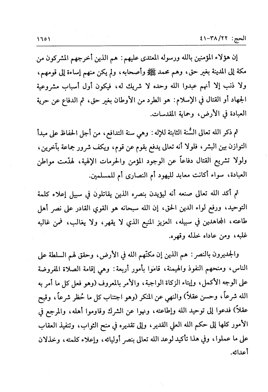 إن هؤلاء المؤمنين بالله ورسوله المعتدى عليهم: هم الذين أخرجهم المشركون من مكة إلى المدينة بغير حق، وهم محمد صلّى الله عليه وسلّم وأصحابه، ولم يكن منهم إساءة إلى قومهم، ولا ذنب إلا أنهم عبدوا الله وحده لا شريك له، فيكون أول أسباب مشروعية الجهاد أو القتال في الإسلام: هو الطرد من الأوطان بغير حق، ثم الدفاع عن حرية العبادة في الأرض، وحماية المقدسات.