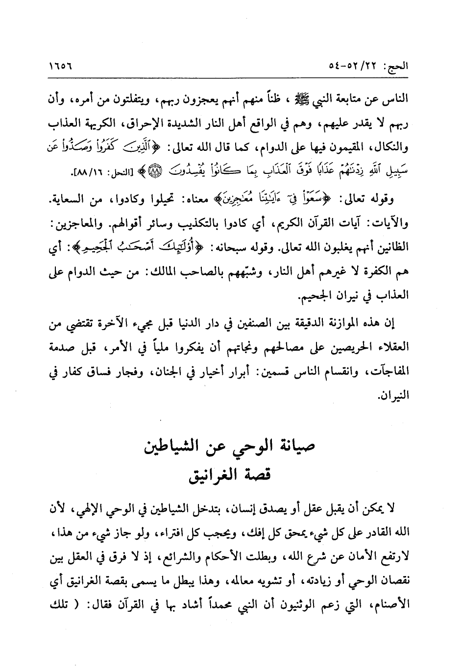 لا يمكن أن يقبل عقل أو يصدق إنسان، بتدخل الشياطين في الوحي الإلهي، لأن الله القادر على كل شيء يمحق كل إفك، ويحجب كل افتراء، ولو جاز شيء من هذا، لارتفع الأمان عن شرع الله، وبطلت الأحكام والشرائع، إذ لا فرق في العقل بين نقصان الوحي أو زيادته، أو تشوية معالمه، وهذا يبطل ما يسمى بقصة الغرانيق أي الأصنام، التي زعم الوثنيون أن النبي محمدا أشاد بها في القرآن فقال: (تلك