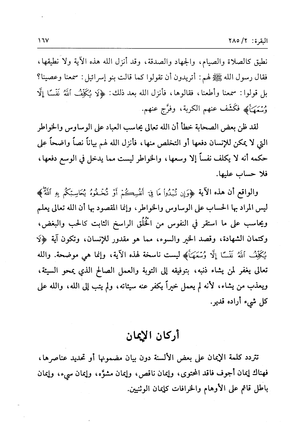 والواقع أن هذه الآية وَإِنْ تُبْدُوا ما فِي أَنْفُسِكُمْ أَوْ تُخْفُوهُ يُحاسِبْكُمْ بِهِ اللَّهُ ليس المراد بها الحساب على الوساوس والخواطر، وإنما المقصود بها أن الله تعالى يعلم ويحاسب على ما استقر في النفوس من الخلق الراسخ الثابت كالحب والبغض، وكتمان الشهادة، وقصد الخير والسوء، مما هو مقدور للإنسان، وتكون آية لا يُكَلِّفُ اللَّهُ نَفْساً إِلَّا وُسْعَها