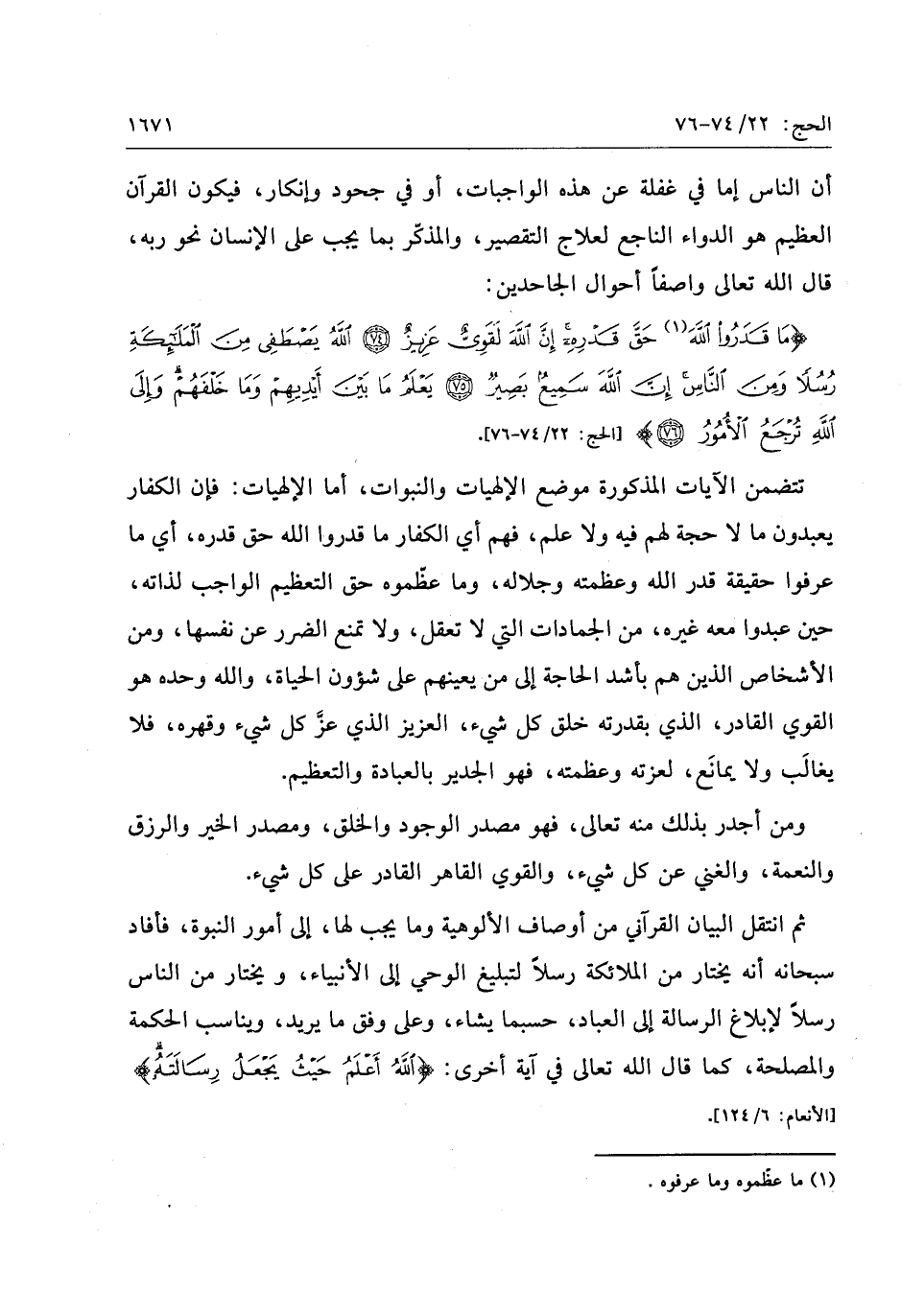 ما قَدَرُوا اللَّهَ حَقَّ قَدْرِهِ إِنَّ اللَّهَ لَقَوِيٌّ عَزِيزٌ (74) اللَّهُ يَصْطَفِي مِنَ الْمَلائِكَةِ رُسُلاً وَمِنَ النَّاسِ إِنَّ اللَّهَ سَمِيعٌ بَصِيرٌ (75) يَعْلَمُ ما بَيْنَ أَيْدِيهِمْ وَما خَلْفَهُمْ وَإِلَى اللَّهِ تُرْجَعُ الْأُمُورُ (76)