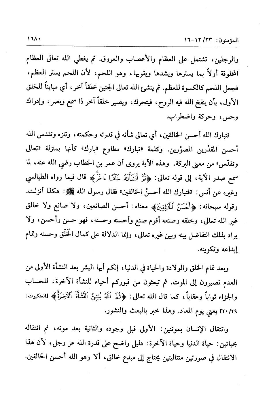 فتبارك الله أحسن الخالقين، أي تعالى شأنه في قدرته وحكمته، وتنزه وتقدس الله أحسن المقدّرين المصوّرين. وكلمة «تبارك» مطاوع «بارك» كأنها بمنزلة «تعالى وتقدّس» من معنى البركة. وهذه الآية يروى أن عمر بن الخطاب رضي الله عنه، لما سمع صدر الآية، إلى قوله تعالى: ثُمَّ أَنْشَأْناهُ خَلْقاً آخَرَ