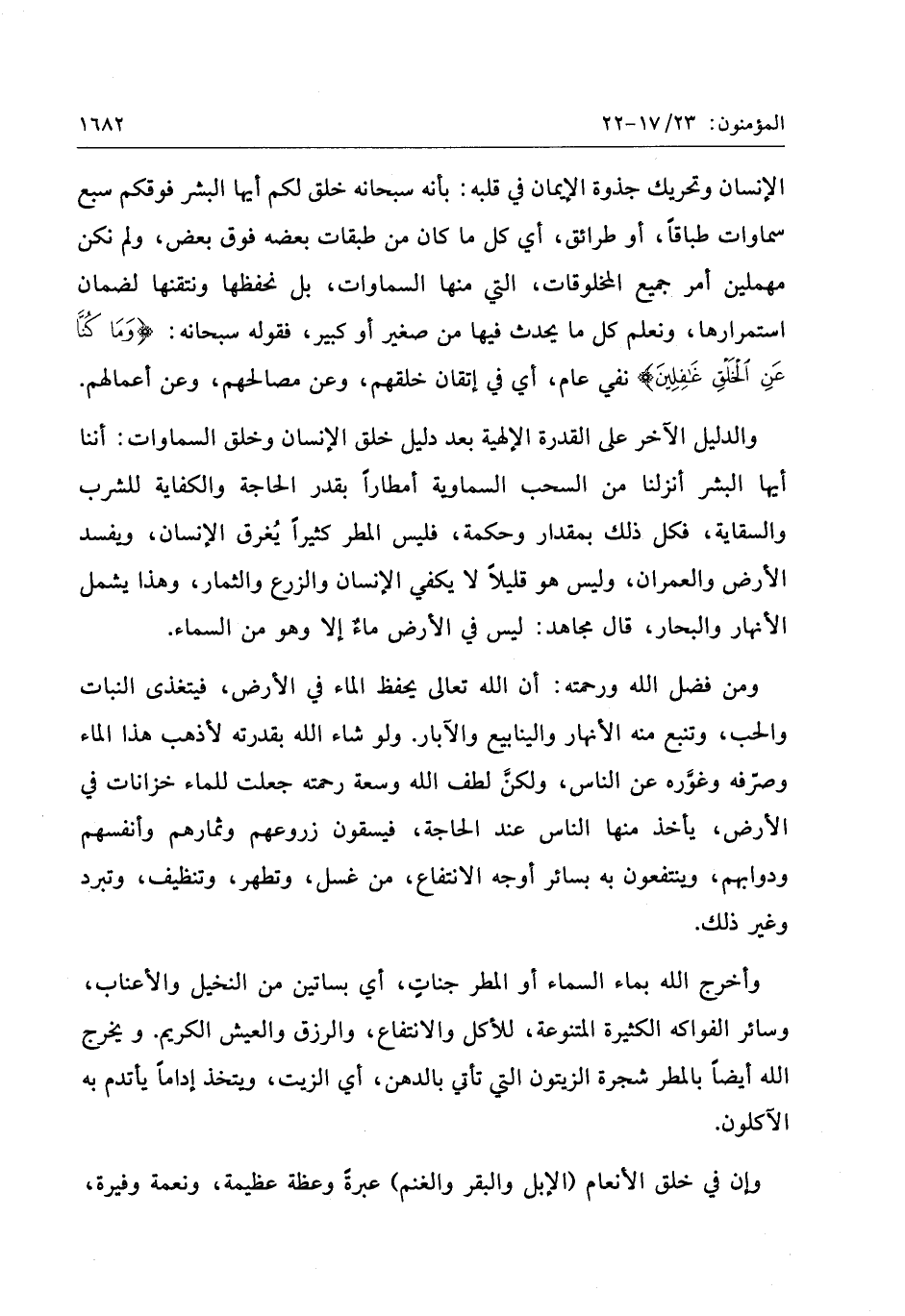 والدليل الآخر على القدرة الإلهية بعد دليل خلق الإنسان وخلق السماوات: أننا أيها البشر أنزلنا من السحب السماوية أمطارا بقدر الحاجة والكفاية للشرب والسقاية، فكل ذلك بمقدار وحكمة، فليس المطر كثيرا يغرق الإنسان، ويفسد الأرض والعمران، وليس هو قليلا لا يكفي الإنسان والزرع والثمار، وهذا يشمل الأنهار والبحار، قال مجاهد: ليس في الأرض ماء إلا وهو من السماء.