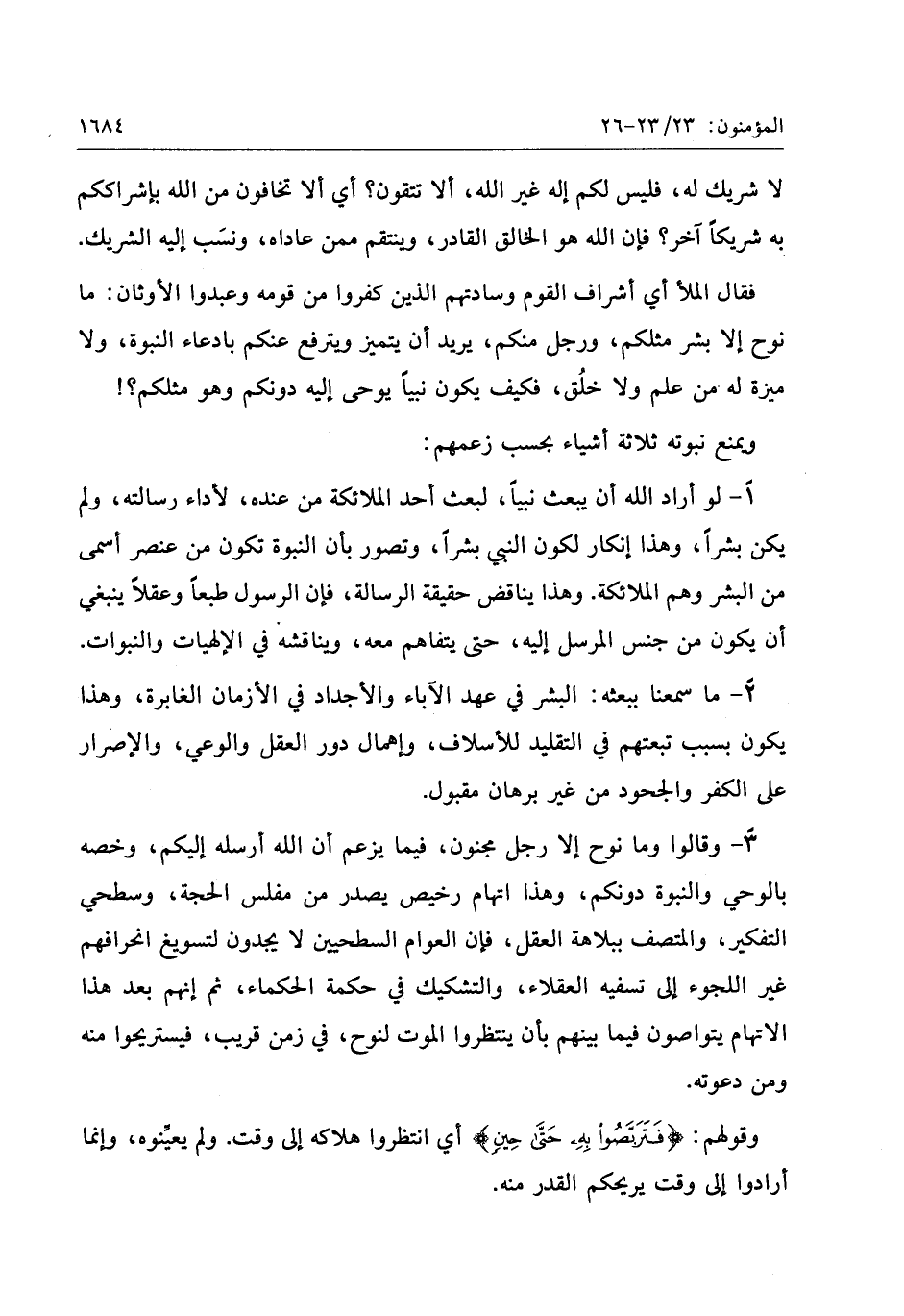 فقال الملأ أي أشراف القوم وسادتهم الذين كفروا من قومه وعبدوا الأوثان: ما نوح إلا بشر مثلكم، ورجل منكم، يريد أن يتميز ويترفع عنكم بادعاء النبوة، ولا ميزة له من علم ولا خلق، فكيف يكون نبيا يوحى إليه دونكم وهو مثلكم؟! ويمنع نبوته ثلاثة أشياء بحسب زعمهم: