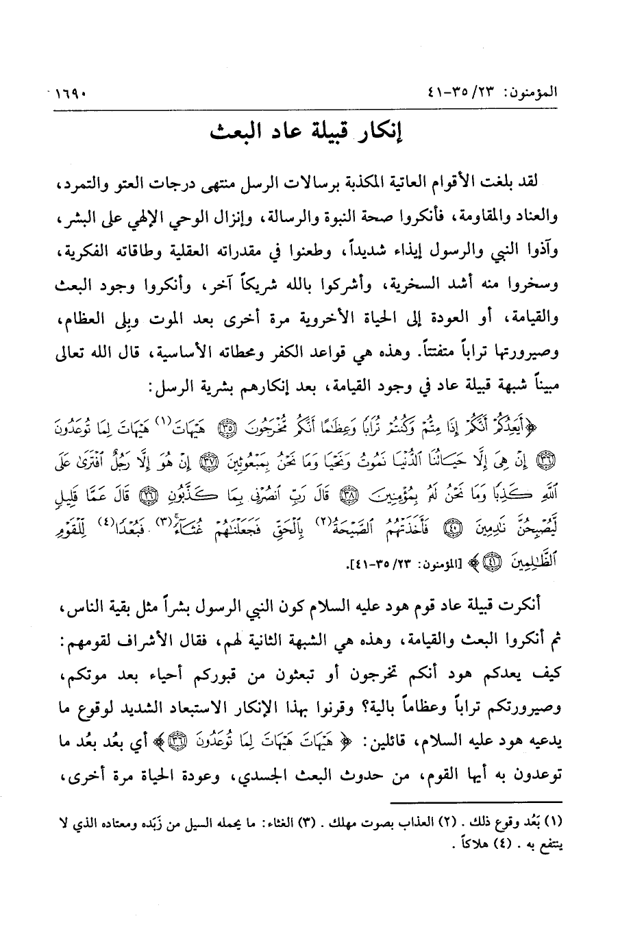 لقد بلغت الأقوام العاتية المكذبة برسالات الرسل منتهى درجات العتو والتمرد، والعناد والمقاومة، فأنكروا صحة النبوة والرسالة، وإنزال الوحي الإلهي على البشر، وآذوا النبي والرسول إيذاء شديدا، وطعنوا في مقدراته العقلية وطاقاته الفكرية، وسخروا منه أشد السخرية، وأشركوا بالله شريكا آخر، وأنكروا وجود البعث والقيامة، أو العودة إلى الحياة الأخروية مرة أخرى بعد الموت وبلى العظام، وصيرورتها ترابا متفتتا. وهذه هي قواعد الكفر ومحطاته الأساسية، قال الله تعالى مبينا شبهة قبيلة عاد في وجود القيامة، بعد إنكارهم بشرية الرسل: