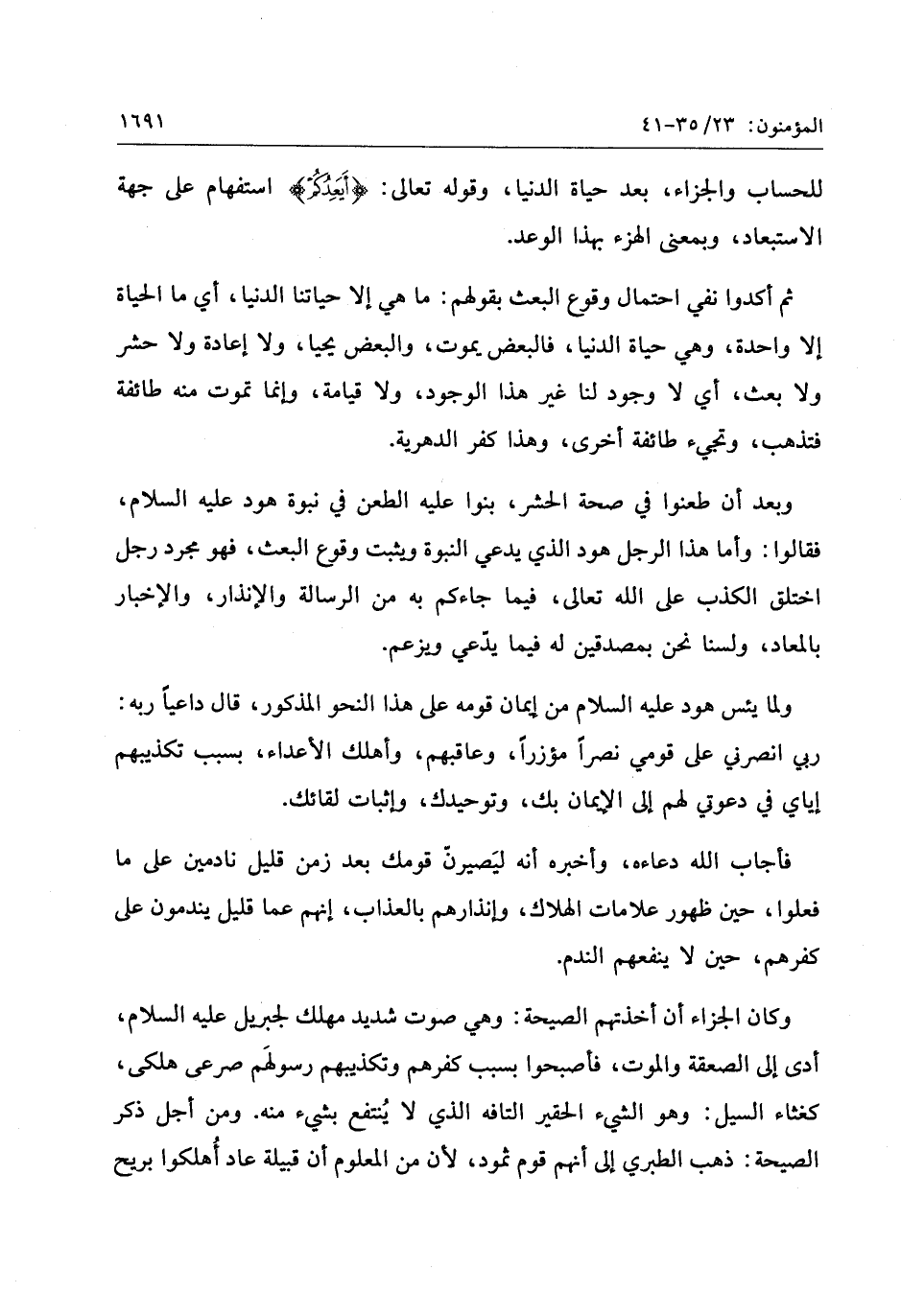 وكان الجزاء أن أخذتهم الصيحة: وهي صوت شديد مهلك لجبريل عليه السلام، أدى إلى الصعقة والموت، فأصبحوا بسبب كفرهم وتكذيبهم رسولهم صرعى هلكى، كغثاء السيل: وهو الشيء الحقير التافه الذي لا ينتفع بشيء منه. ومن أجل ذكر الصيحة: ذهب الطبري إلى أنهم قوم ثمود، لأن من المعلوم أن قبيلة عاد أهلكوا بريح