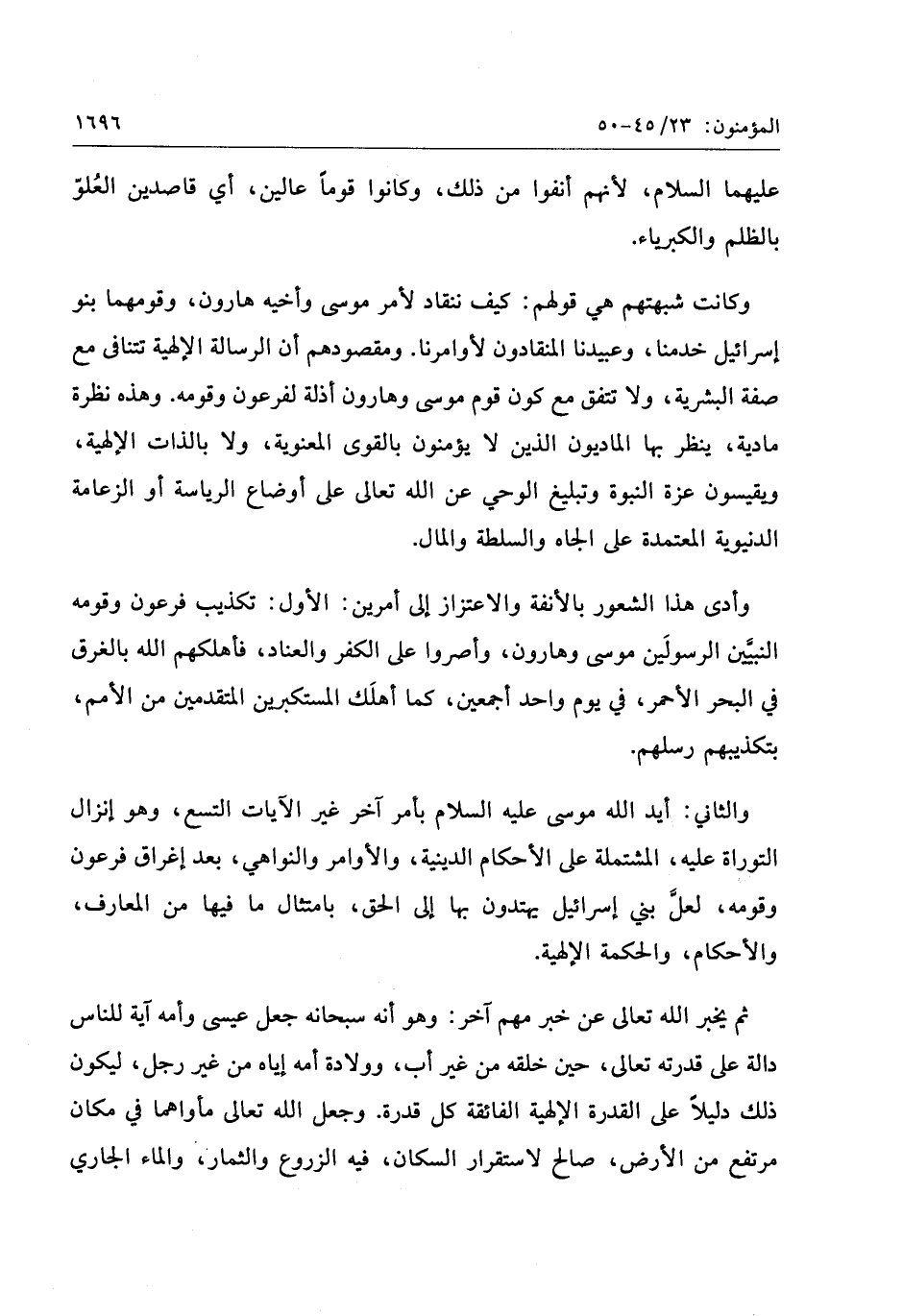 والثاني: أيد الله موسى عليه السلام بأمر آخر غير الآيات التسع، وهو إنزال التوراة عليه، المشتملة على الأحكام الدينية، والأوامر والنواهي، بعد إغراق فرعون وقومه، لعلّ بني إسرائيل يهتدون بها إلى الحق بامتثال ما فيها من المعارف، والأحكام، والحكمة الإلهية.