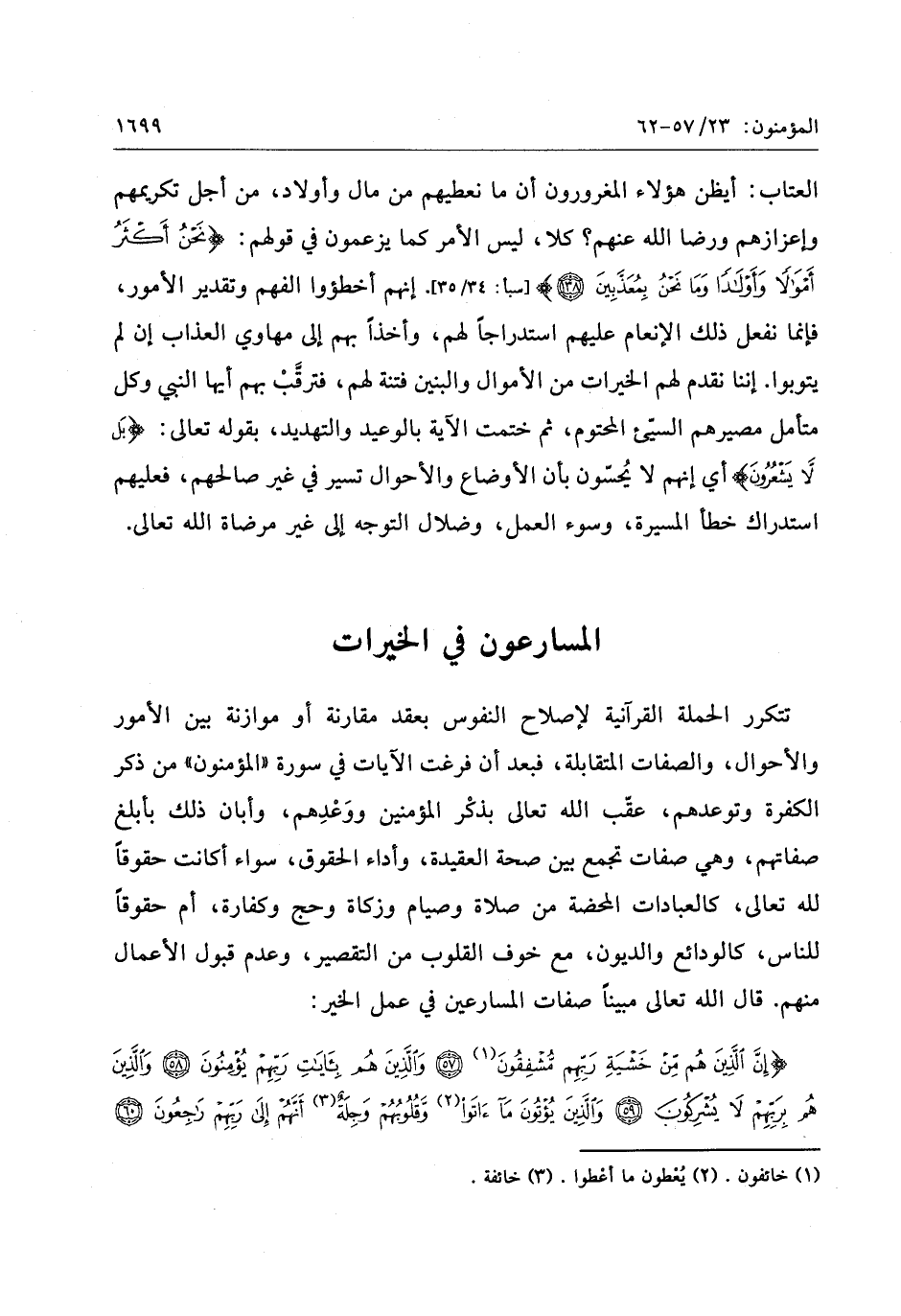 تتكرر الحملة القرآنية لإصلاح النفوس بعقد مقارنة أو موازنة بين الأمور والأحوال، والصفات المتقابلة، فبعد أن فرغت الآيات في سورة «المؤمنون» من ذكر الكفرة وتوعدهم، عقّب الله تعالى بذكر المؤمنين ووعدهم، وأبان ذلك بأبلغ صفاتهم، وهي صفات تجمع بين صحة العقيدة، وأداء الحقوق، سواء أكانت حقوقا لله تعالى، كالعبادات المحضة من صلاة وصيام وزكاة وحج وكفارة، أم حقوقا للناس، كالودائع والديون، مع خوف القلوب من التقصير، وعدم قبول الأعمال منهم. قال الله تعالى مبينا صفات المسارعين في عمل الخير:
