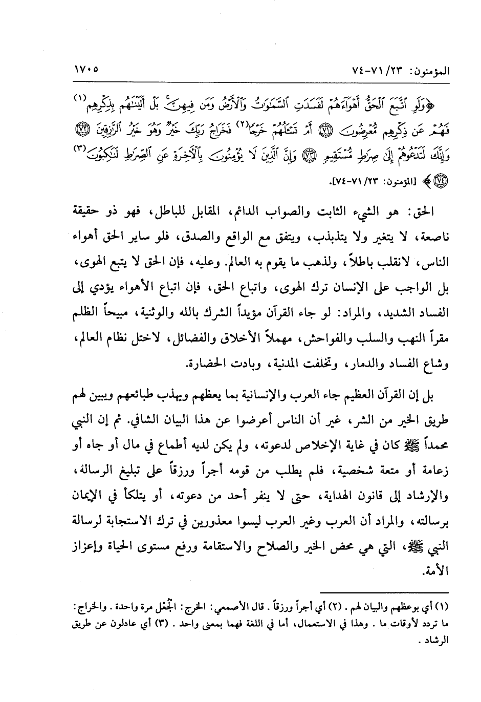 وَلَوِ اتَّبَعَ الْحَقُّ أَهْواءَهُمْ لَفَسَدَتِ السَّماواتُ وَالْأَرْضُ وَمَنْ فِيهِنَّ بَلْ أَتَيْناهُمْ بِذِكْرِهِمْ فَهُمْ عَنْ ذِكْرِهِمْ مُعْرِضُونَ (71) أَمْ تَسْأَلُهُمْ خَرْجاً فَخَراجُ رَبِّكَ خَيْرٌ وَهُوَ خَيْرُ الرَّازِقِينَ (72) وَإِنَّكَ لَتَدْعُوهُمْ إِلى صِراطٍ مُسْتَقِيمٍ (73) وَإِنَّ الَّذِينَ لا يُؤْمِنُونَ بِالْآخِرَةِ عَنِ الصِّراطِ لَناكِبُونَ (74)